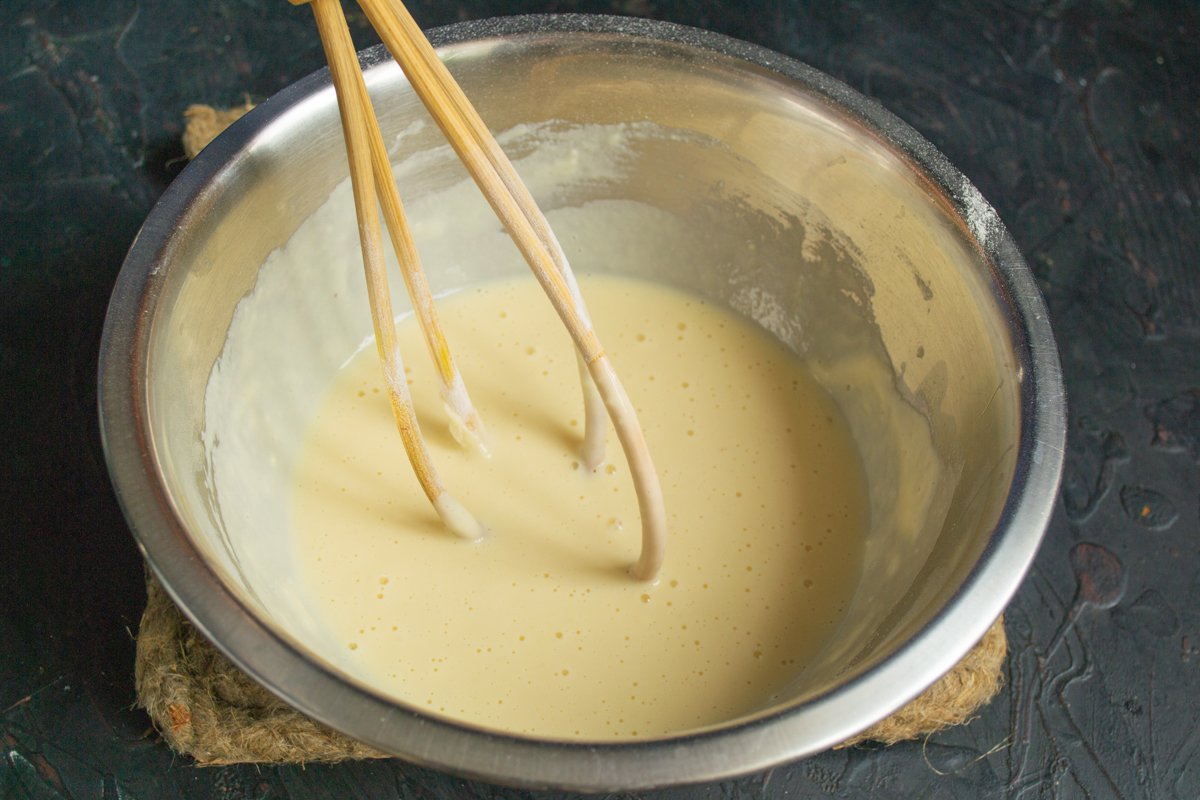 Насыпаем в миску с жидкими ингредиентами пшеничную муку, замешиваем жидкое тесто.