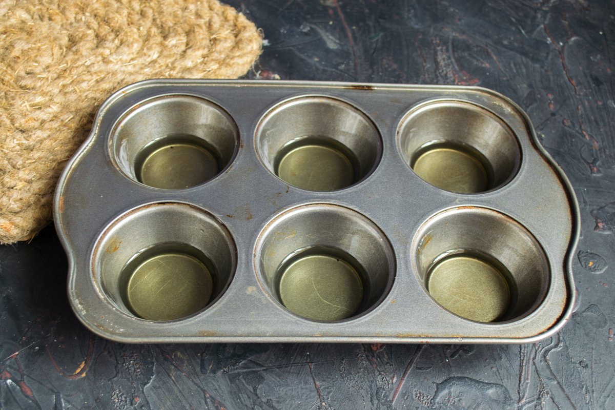 Для приготовления берём обычную кексовую форму с ячейками. В каждую ячейку наливаем примерно две чайные ложки рафинированного растительного масла для жарки. Нагреваем духовой шкаф до 200 градусов по Цельсию. Ставим форму с маслом в разогретую духовку, хорошо раскаляем масло. Можно нагревать его до появления дымка, в общем, разогреваем сильно.