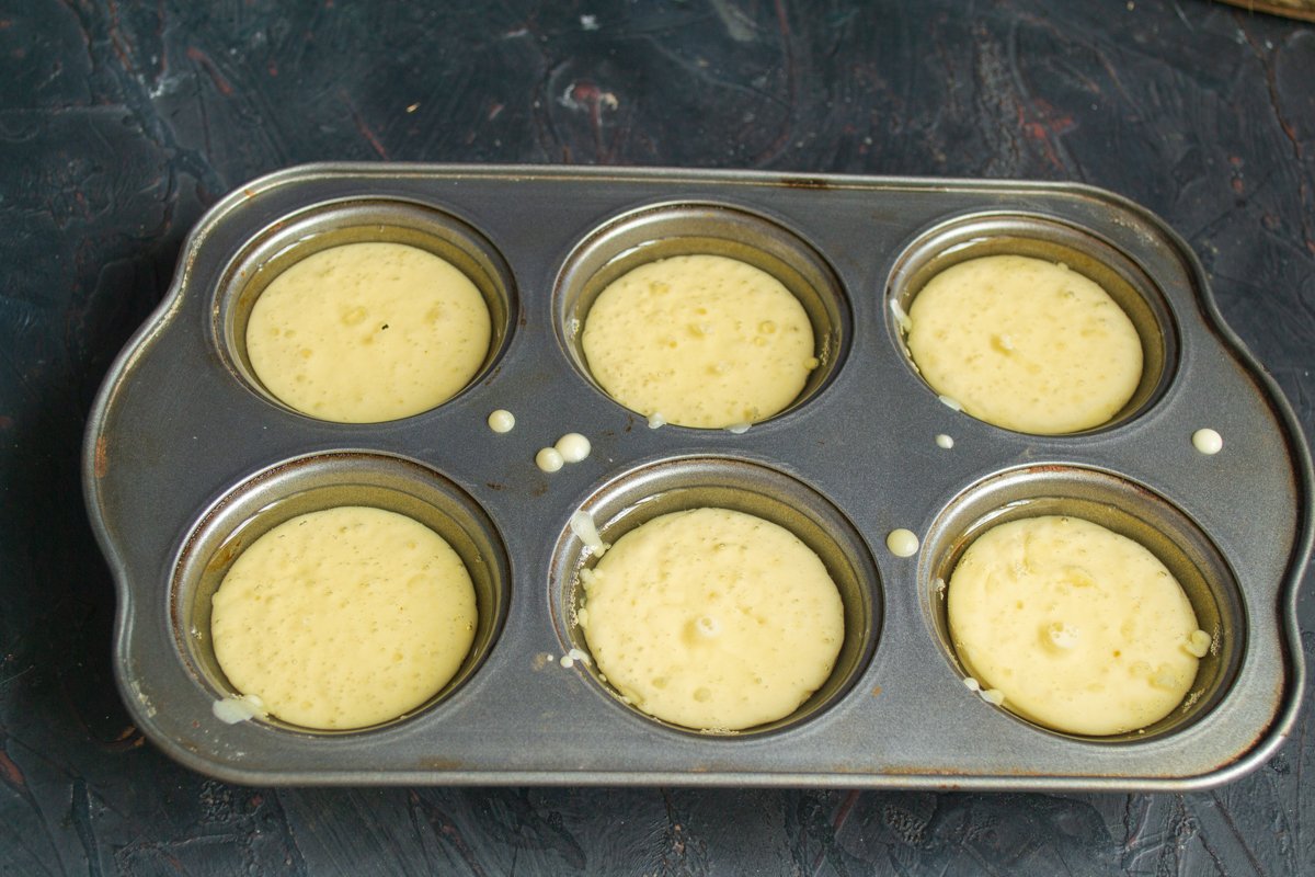 В каждую ячейку с разогретым маслом наливаем равное количество теста, отправляем форму в раскалённый духовой шкаф.