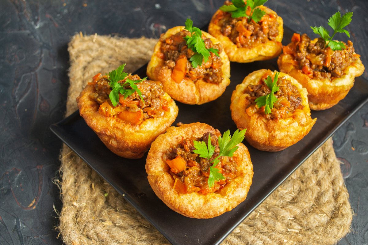 Английская классика — йоркширские пудинги с говядиной и овощами. Несладкие пудинги с мясной начинкой получаются сытными, это полноценный обед или плотный завтрак для тех, кому нужно хорошо подкрепиться перед началом рабочего дня. Готовить пудинги нужно в специальной форме или в форме для маффинов с ячейками.