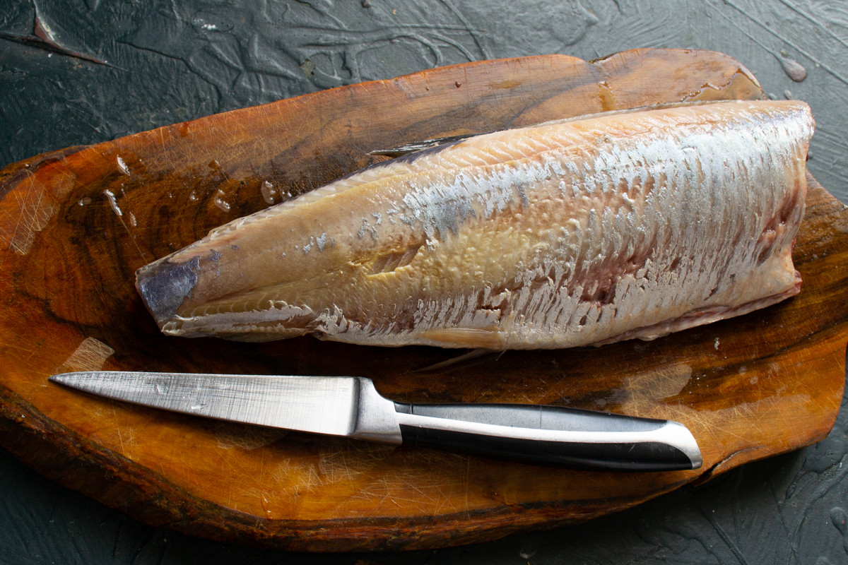 Разделываем селедку: отрезаем голову и хвост, разрезаем брюхо, удаляем внутренности и тщательно промываем рыбу холодной проточной водой. Обсушиваем, кладём на доску, прорезаем кожу вдоль хребта. Снимаем кожу от головы к хвосту сначала с одной, затем с другой стороны.