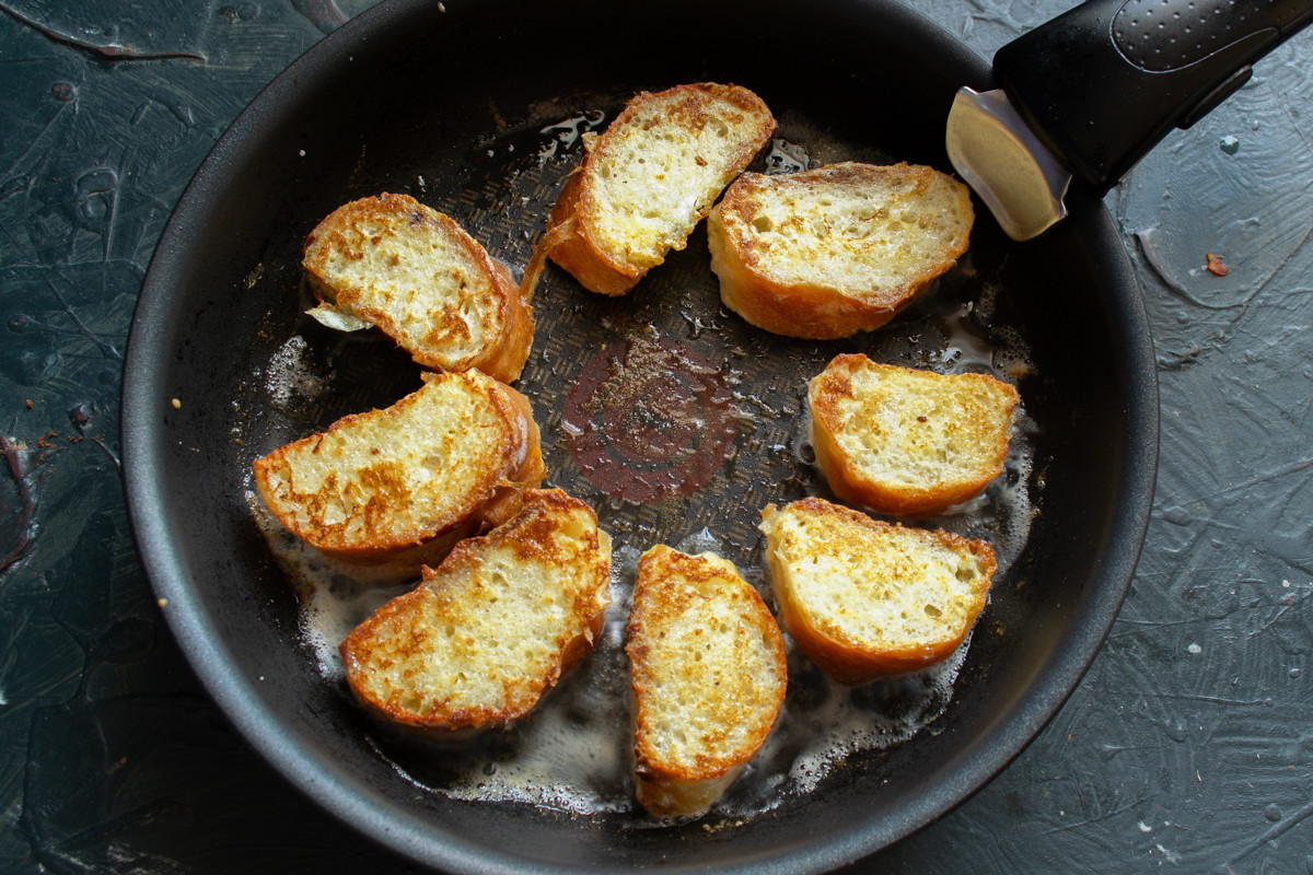 Смазываем сковороду растительным маслом, кладём кусочек сливочного. В растопленном масле обжариваем кусочки багета до золотистого цвета с двух сторон.