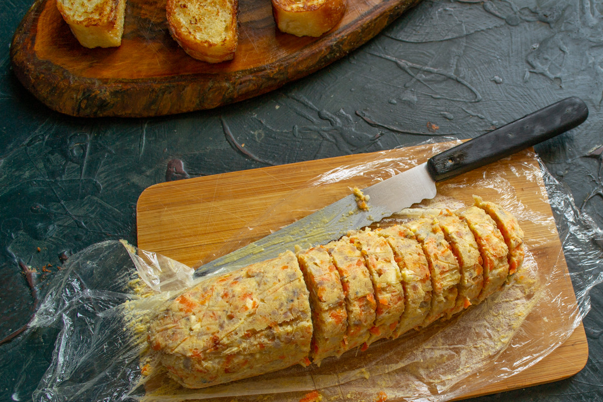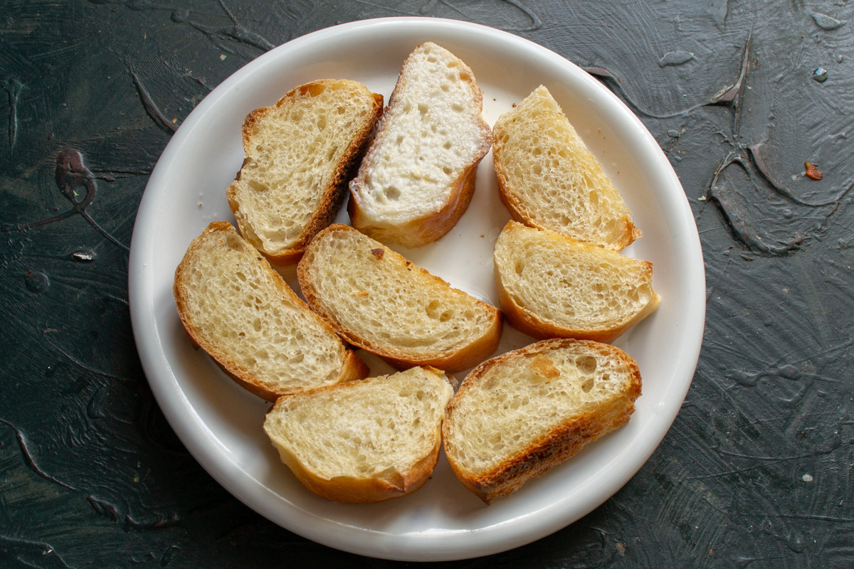 Гренки из багета выкладываем на доску, остужаем. Охлажденный селедочный паштет нарезаем ломтиками толщиной около сантиметра.