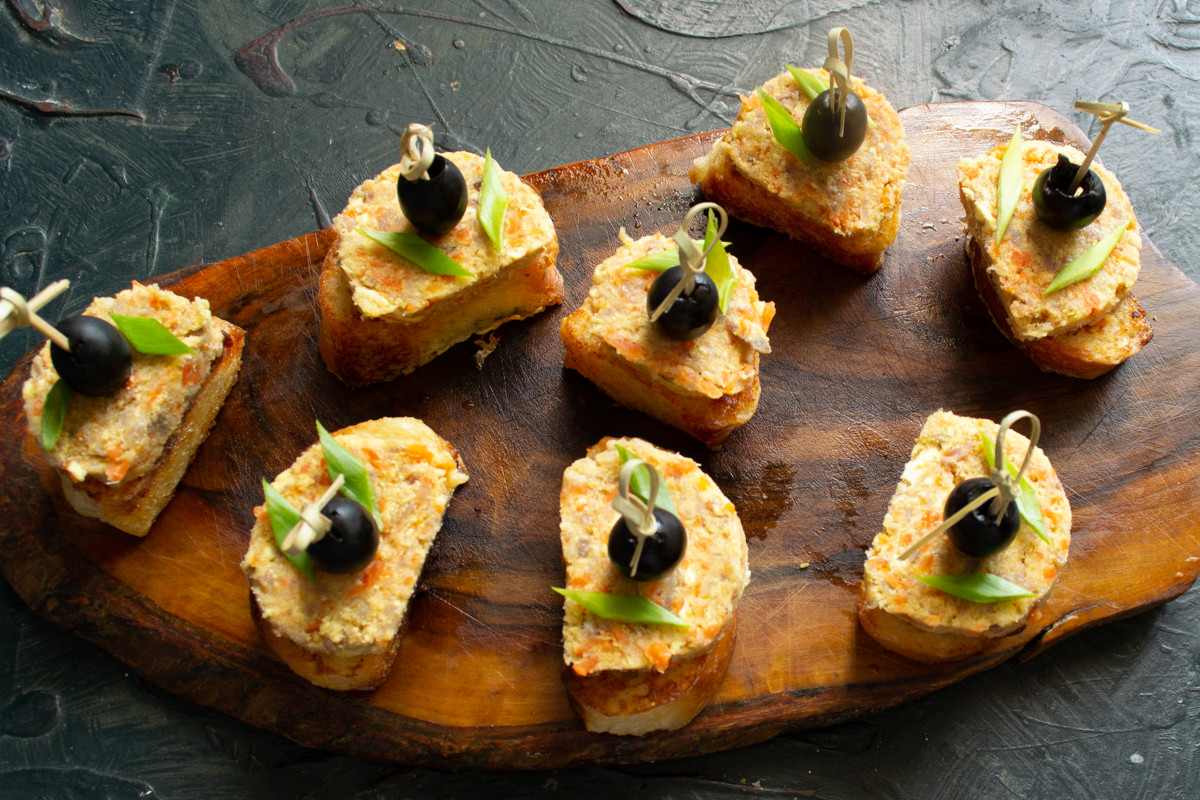Закуска из сельди к праздничному столу – канапе из селедочного паштета на гренке, украшенные оливками и зелёным лучком. Паштет из селедки со сливочным маслом по вкусу напоминает красную икру. Во времена тотального дефицита этим рецептом хозяйки пользовались вовсю, заменяя недорогим, но вкусным паштетом красную икру на праздничном столе. Несмотря на простоту и небольшой бюджет, канапе очень вкусные и разлетаются моментально, рекомендую.