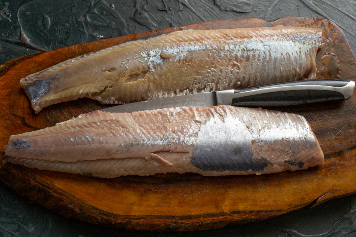 Отделяем два филе от хребта, выбираем мелкие косточки руками или выдергиваем пинцетом. Для рецепта достаточно 1 филе большой селедки, если любите соленое, то используйте целую сельдь, немного увеличив количество масла в рецепте.
