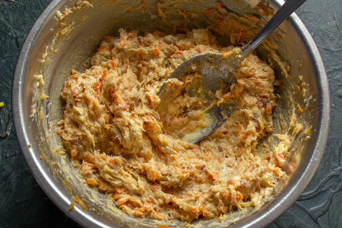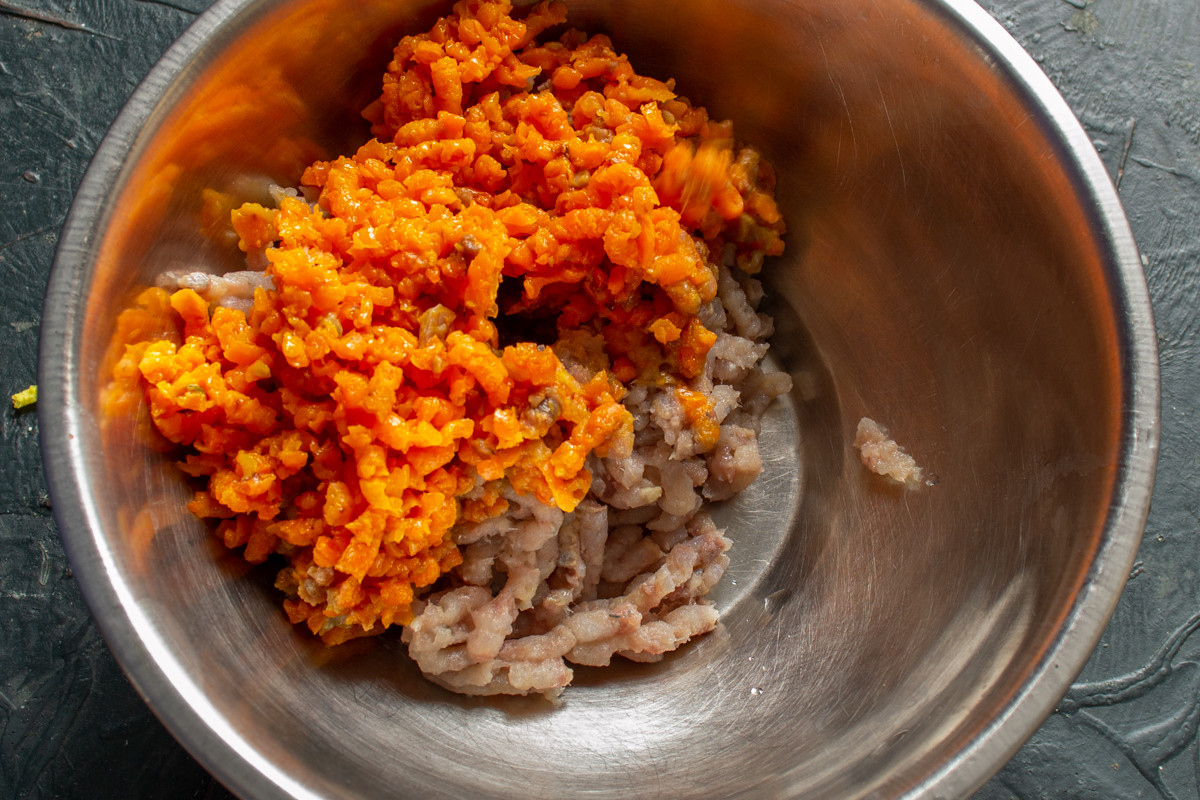 Морковь натираем на тёрке, обжариваем на растительном масле 5 минут, остужаем. Отправляем остывшую морковку в мясорубку следом за селедкой.