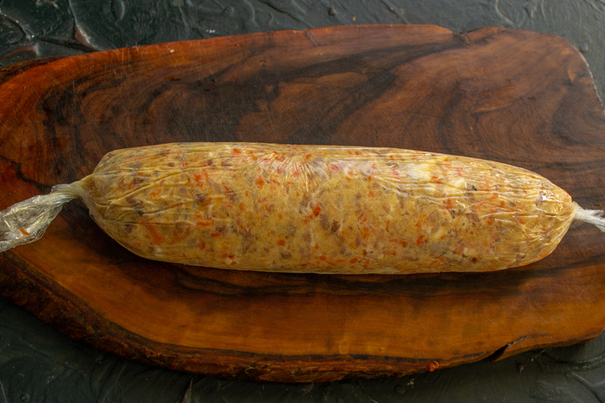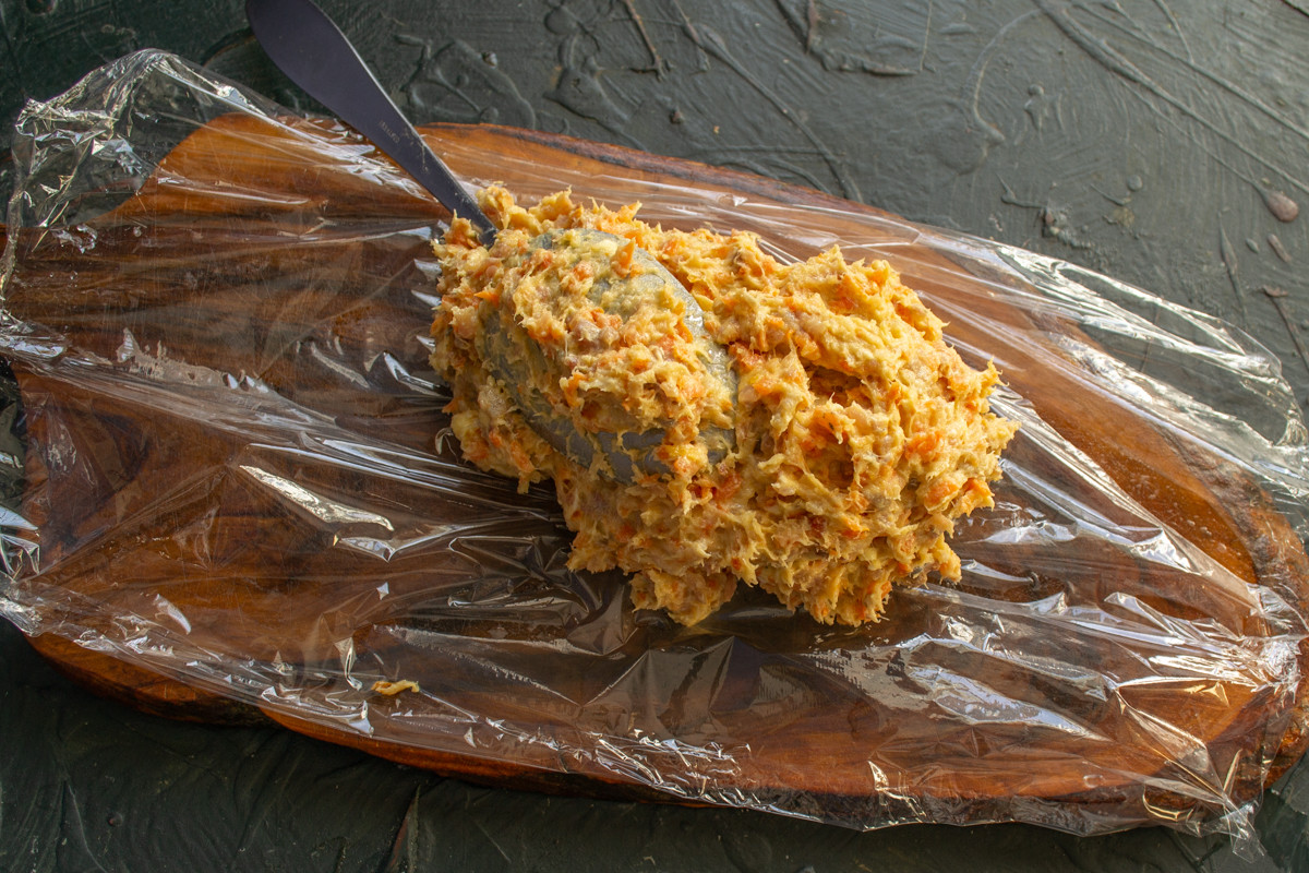 Формируем длинную колбаску, аккуратно оборачиваем пленкой, как конфету. Скручиваем концы пленки, сворачиваем колбаску толщиной 4-5 сантиметров. Убираем селедочный паштет в морозильную камеру, если нужно приготовить закуску быстро, или оставляем в холодильнике, там она застывает за 2-3 часа.