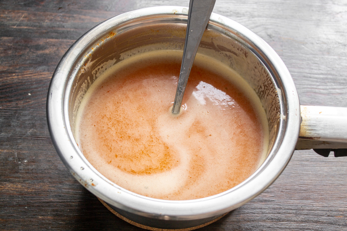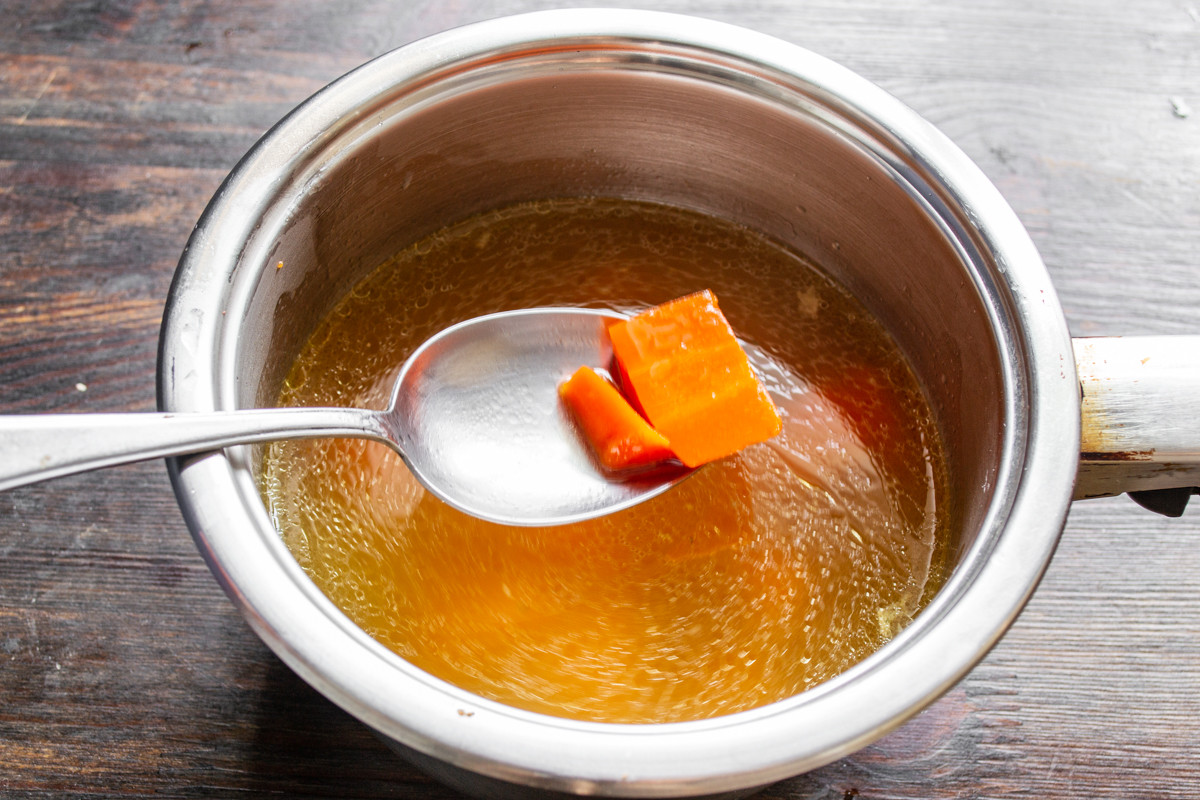 Ставим кастрюльку на плиту. Нагреваем примерно до 80 градусов по Цельсию. Образовавшуюся пенку снимаем столовой ложкой. В результате получится вкусный бульон насыщенного оранжевого цвета.
