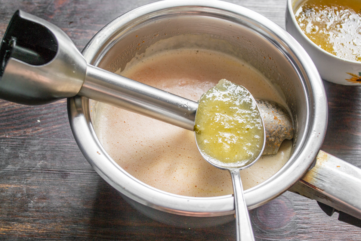 Погружным блендером измельчаем бульон с морковью до однородного состояния. Добавляем бульон с желатином и еще раз все хорошо перемешиваем.