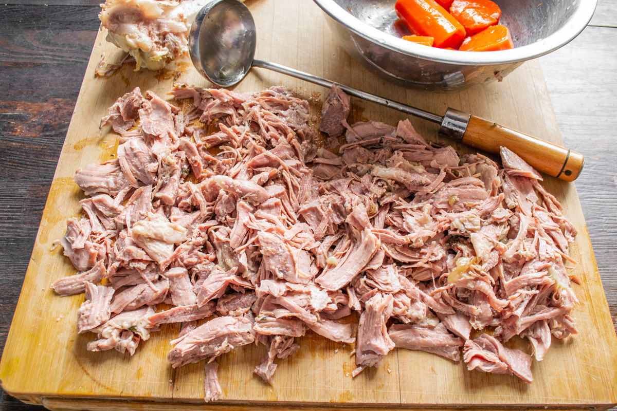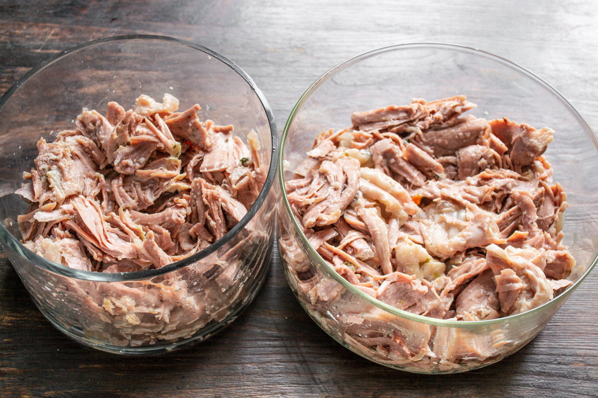 Снимаем с голеней кожу, мясо отделяем от костей. Разрываем мясо на волокна или нарезаем небольшими кусочками. Оставить кожу или нет, решайте сами. Для диетического меню лучше приготовить заливное без кожи.