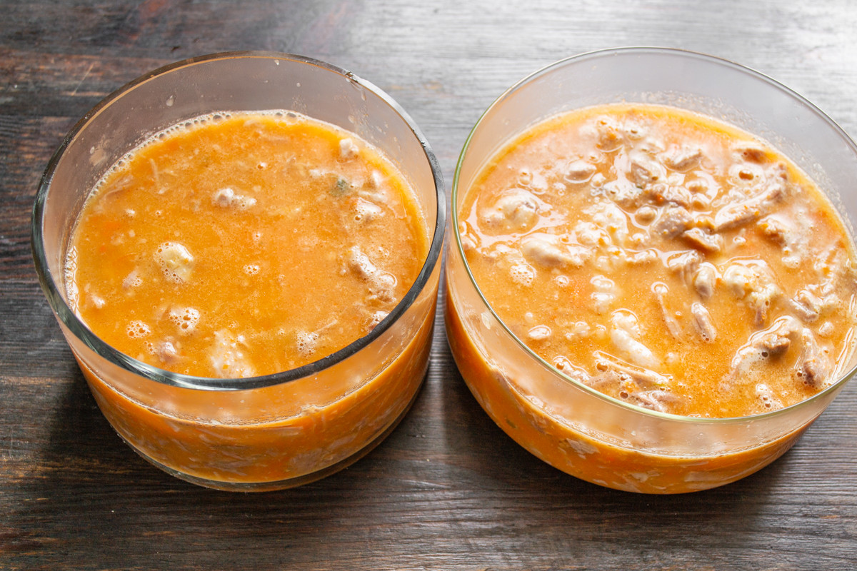 Наливаем в тарелки бульон с морковью и желатином. Чуть перемешиваем, чтобы мясо и бульон смешались равномерно.