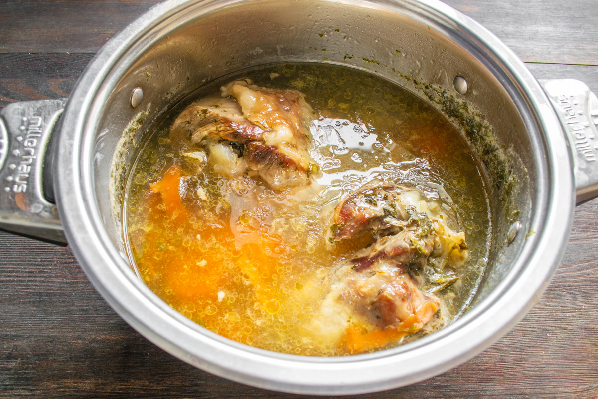 В этом рецепте весь приготовленный бульон вам не понадобится. Перелейте остатки бульона в контейнеры, плотно закройте, остудите и заморозьте. Замороженный бульон долго хранится, его можно использовать для супа и соусов.
