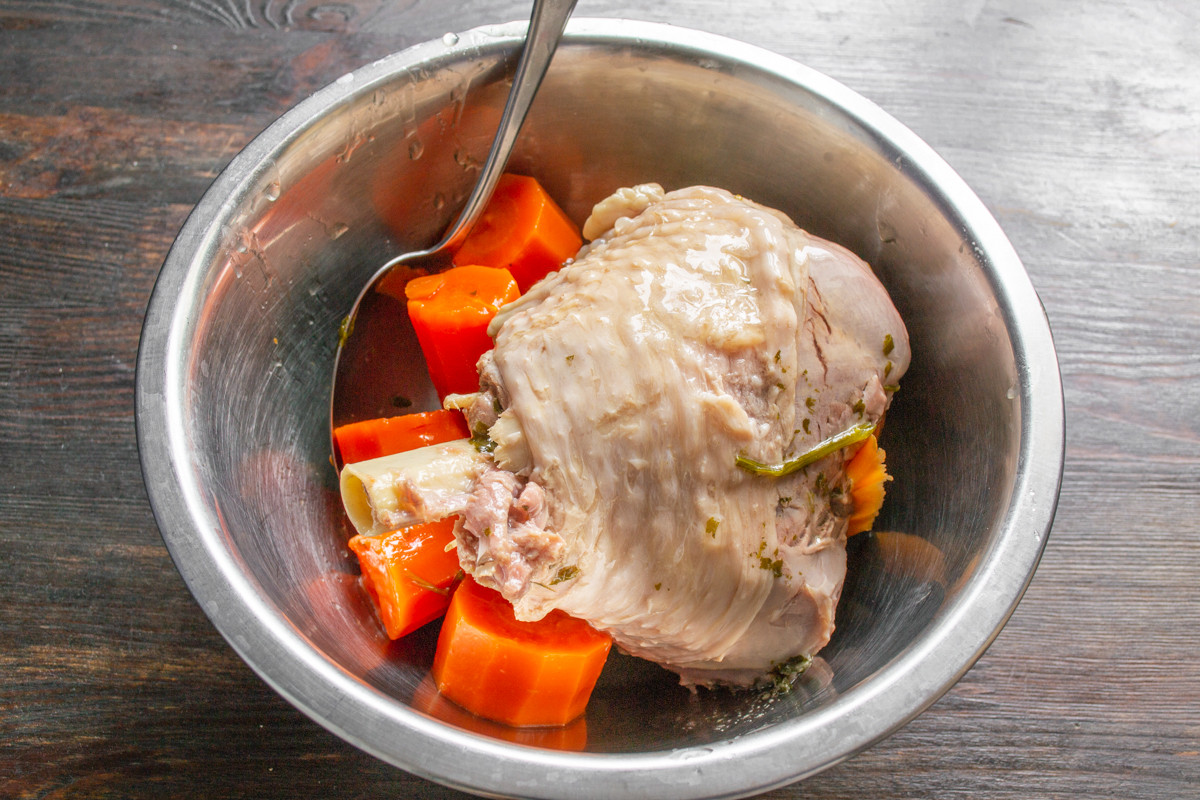 Голени индейки кладем в большую кастрюлю. Добавляем горошины черного перца, лавровые листья. Кладем разрезанную на 4 части луковицу и раздавленные зубчики чеснока. Насыпаем сушеную петрушку. Наливаем холодную воду так, чтобы вода полностью закрывала индейку. По вкусу солим. Нагреваем до кипения. Варим на тихом огне 2 часа 30 минут. За 20 минут до готовности кладем в кастрюлю очищенную сырую морковь. Готовую индейку остужаем в бульоне.