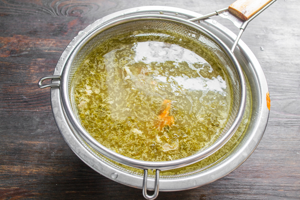С процеженного бульона снимаем жир. Это можно сделать двумя способами – остудить бульон и удалить застывший жир ложкой, или промокнуть бульон бумажным полотенцем, чтобы к бумаге прилип жир.