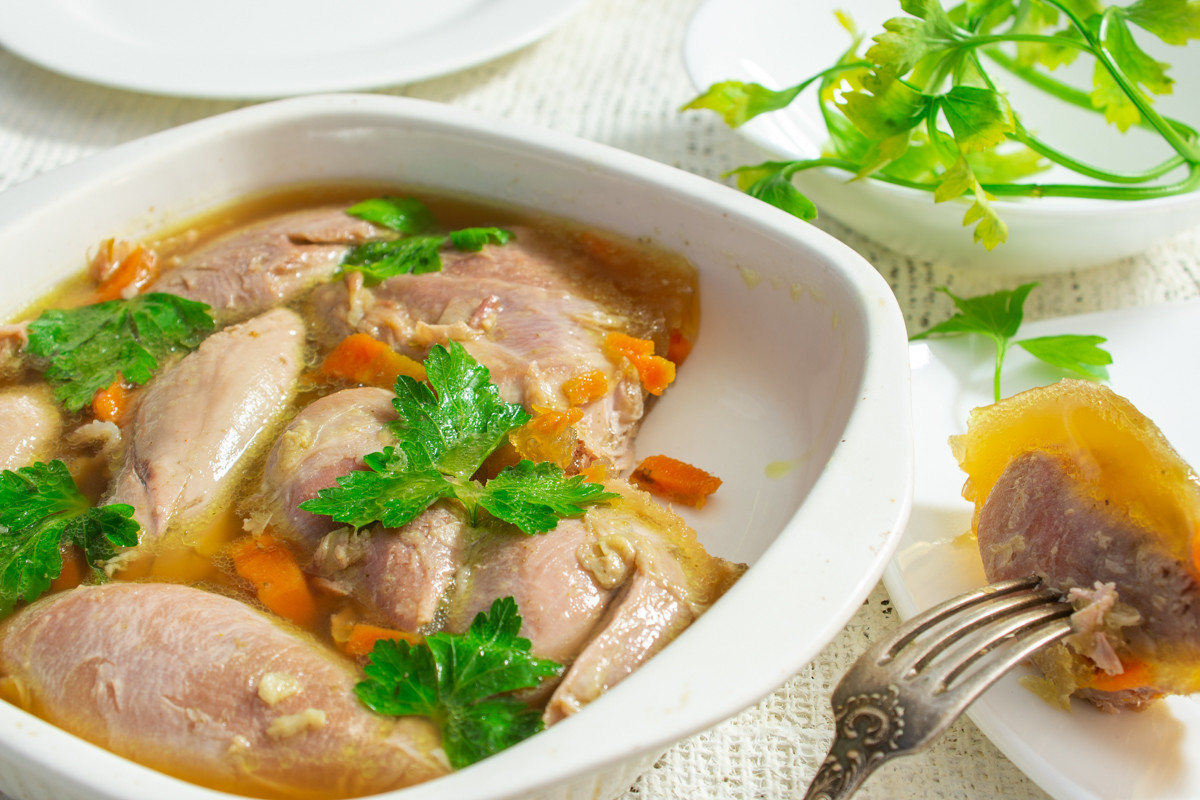 Заливное из индейки с соевым соусом очень вкусно съесть с хреном или горчицей.