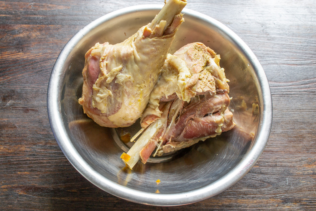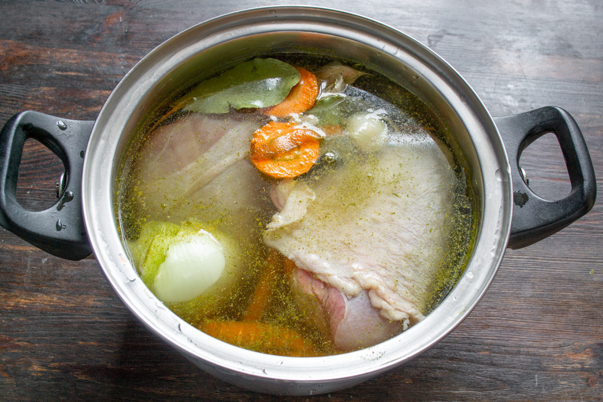Морковь тщательно моем щеткой, очищаем овощным скребком. В кастрюлю кладем морковную кожуру (очистки), луковицу, разрезанную на несколько частей, раздавленные зубчики чеснока, 1 чайную ложку сушеной петрушки, щепотку куркумы, лавровые листья и несколько горошин черного перца. Кладем голени индейки, вливаем 1,5 л холодной воды, насыпаем 2 чайные ложки морской соли.
