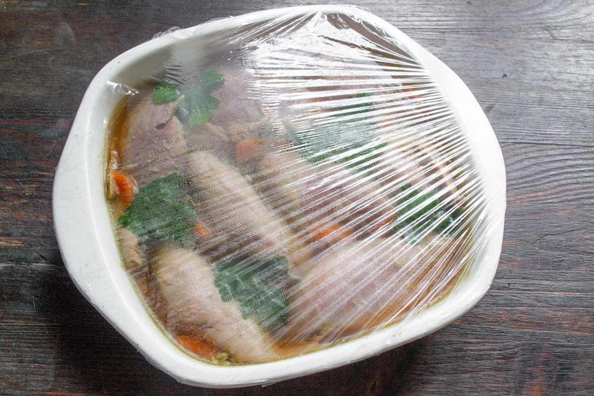 Затягиваем форму пищевой пленкой и убираем в холодильник. Оставляем заливное в холодильнике на 6-8 часов, чтобы оно хорошо застыло.