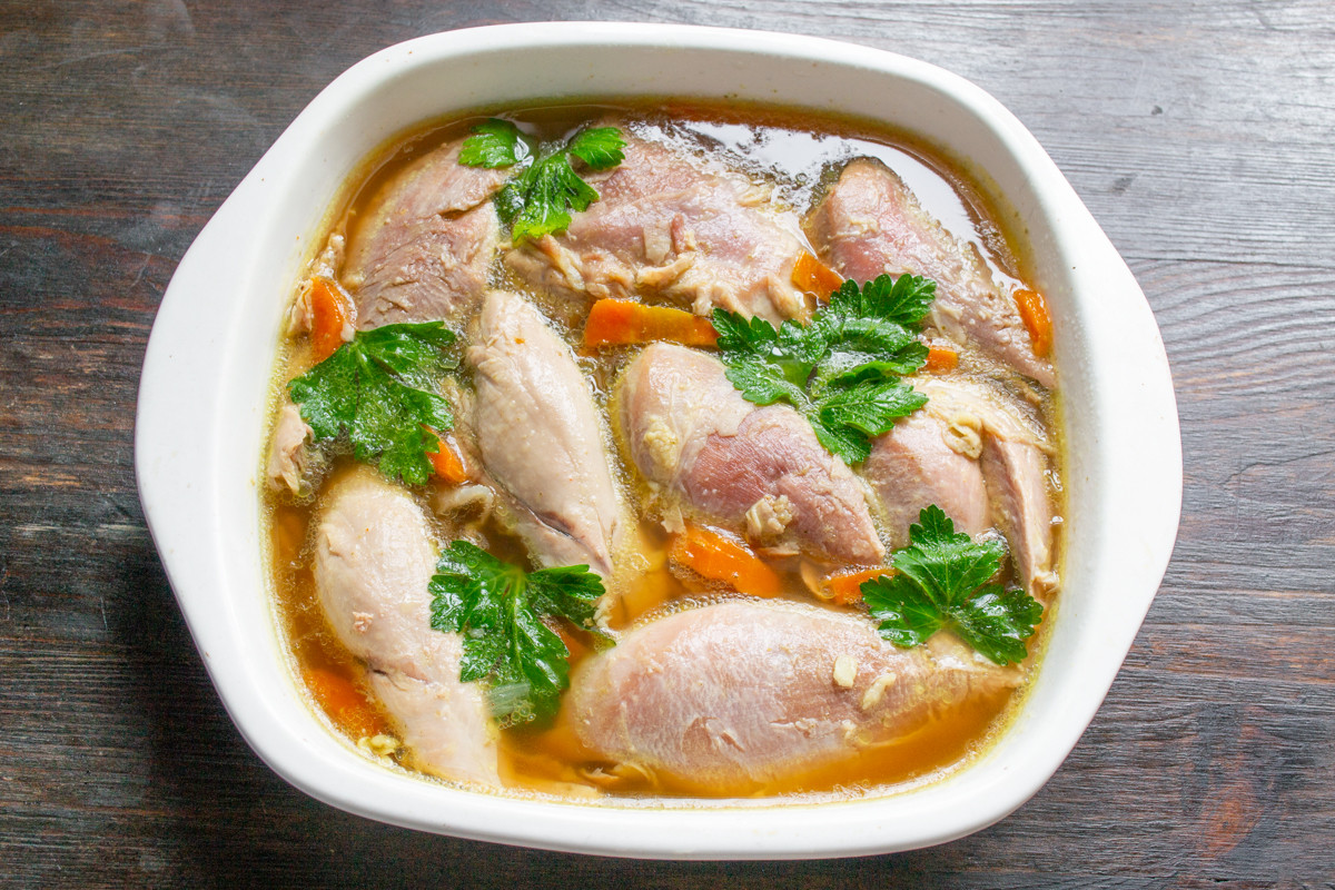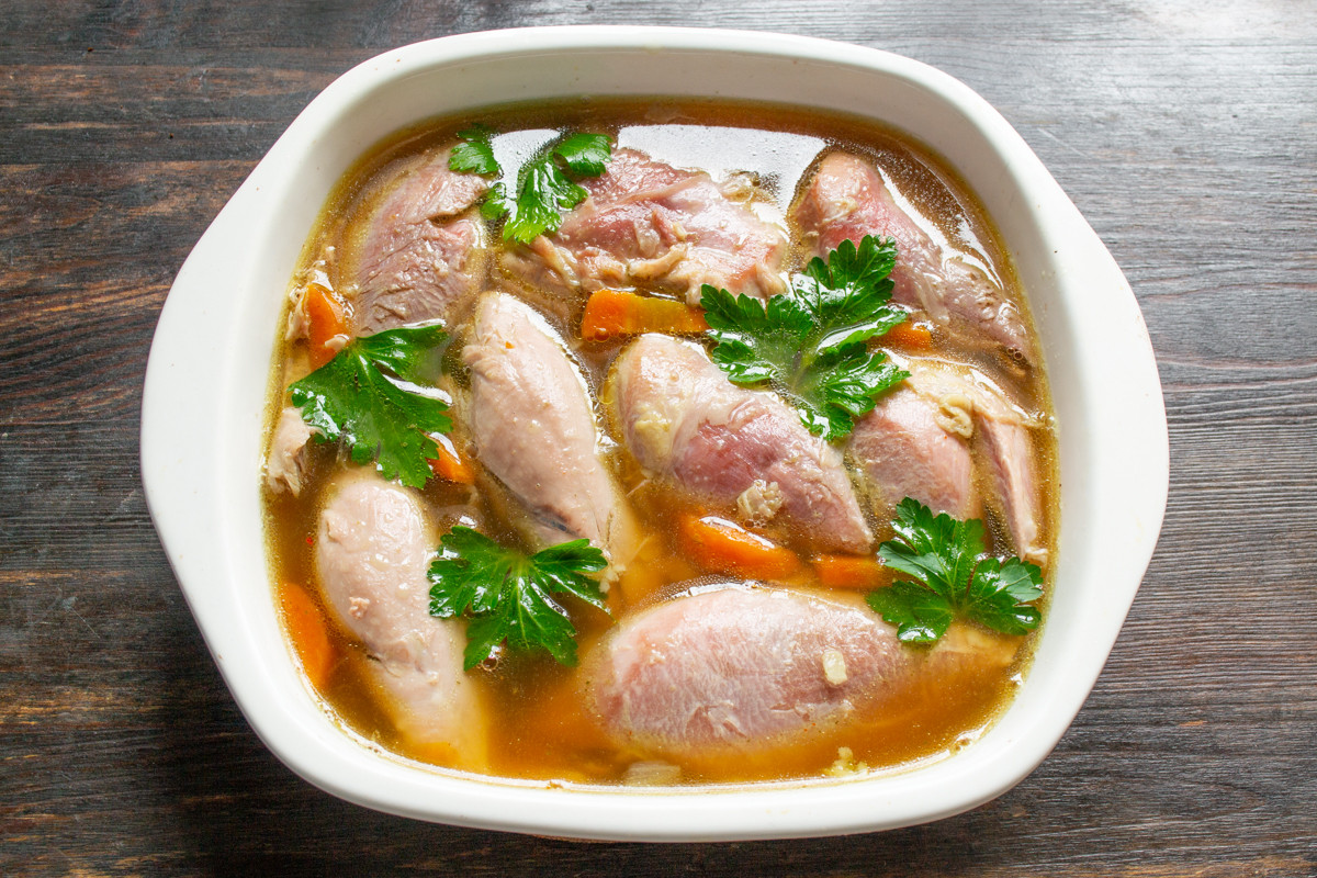 Простая в приготовлении и невероятно вкусная холодная закуска – заливное из индейки с соевым соусом. Сварить индейку дело несложное, смешать бульон с желатином ещё проще. Останется подождать некоторое время пока заливное застынет. Нежное мясо индейки в изумительном желе – отличное блюдо, вкуснее покупной ветчины! Используйте ножки (голени или бедра) для этого рецепта. Время варки зависит от размера птицы.