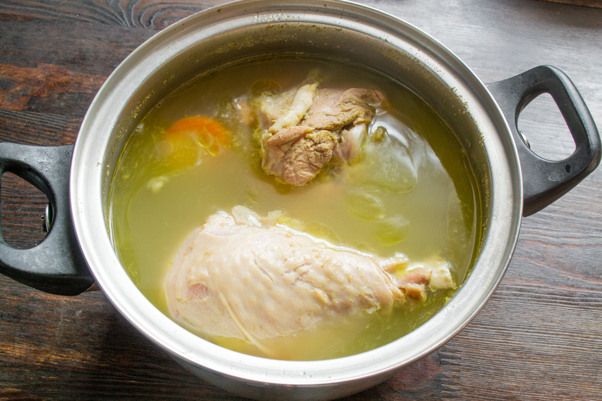 400 мл бульона нагреваем почти до кипения. Добавляем растворенный в бульоне желатин и все хорошо перемешиваем.