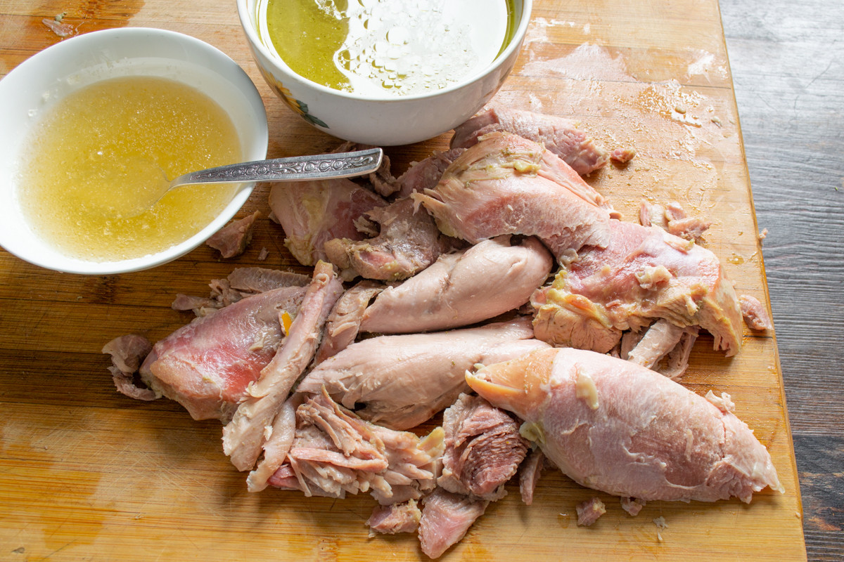 Снимаем с ножек кожу, затем отделяем мясо от костей. Разбиваем мясо на крупные куски. Наливаем 400-500 мл бульона в чашу, остальной бульон не понадобится, его можно хранить в холодильники и использовать для приготовления супов и соусов. 100 мл бульона остужаем до комнатной температуры, замачиваем в нем порошковый желатин на 20 минут.