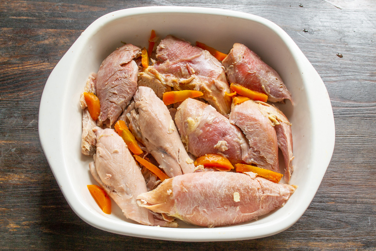 В неглубокую форму или тарелку с бортиками выкладываем кусочки индейки и вареную морковку в один слой.