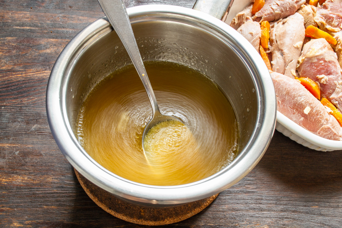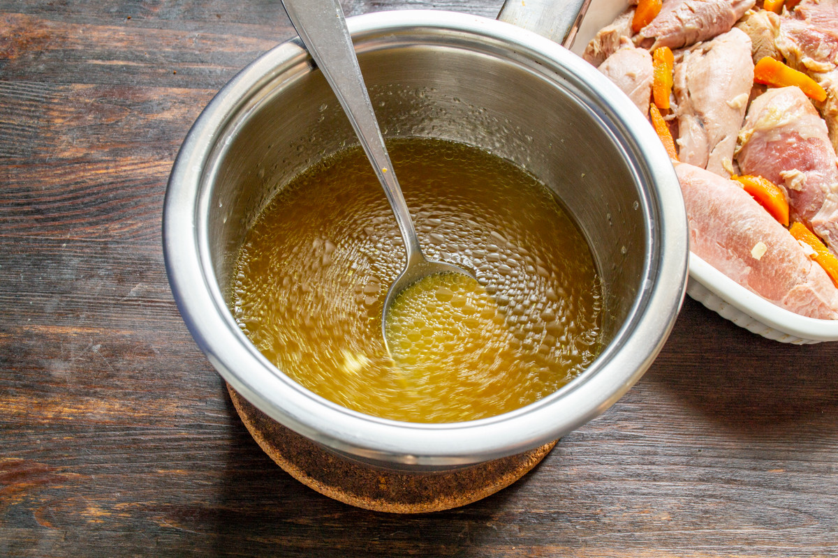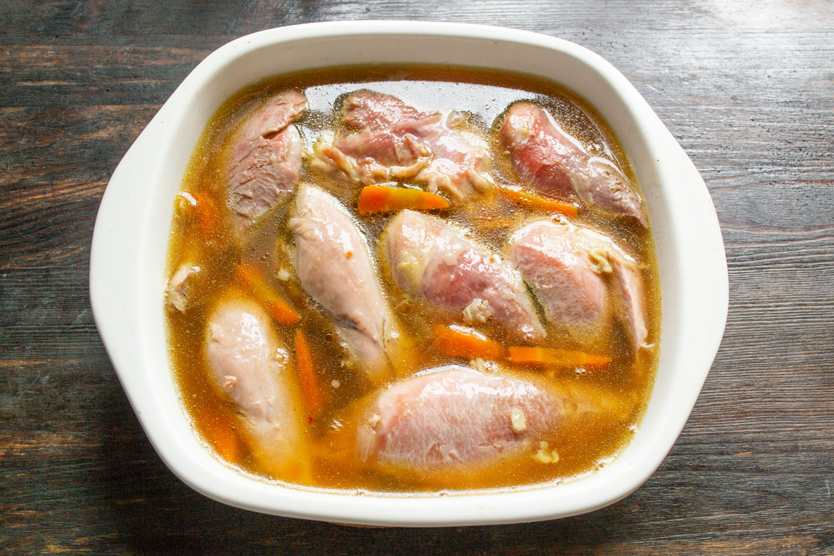 Добавляем в бульон соевый соус и выливаем в форму на индейку. Я советую соевый соус с чесноком и чили. Немного пикантности этому желе не повредит.