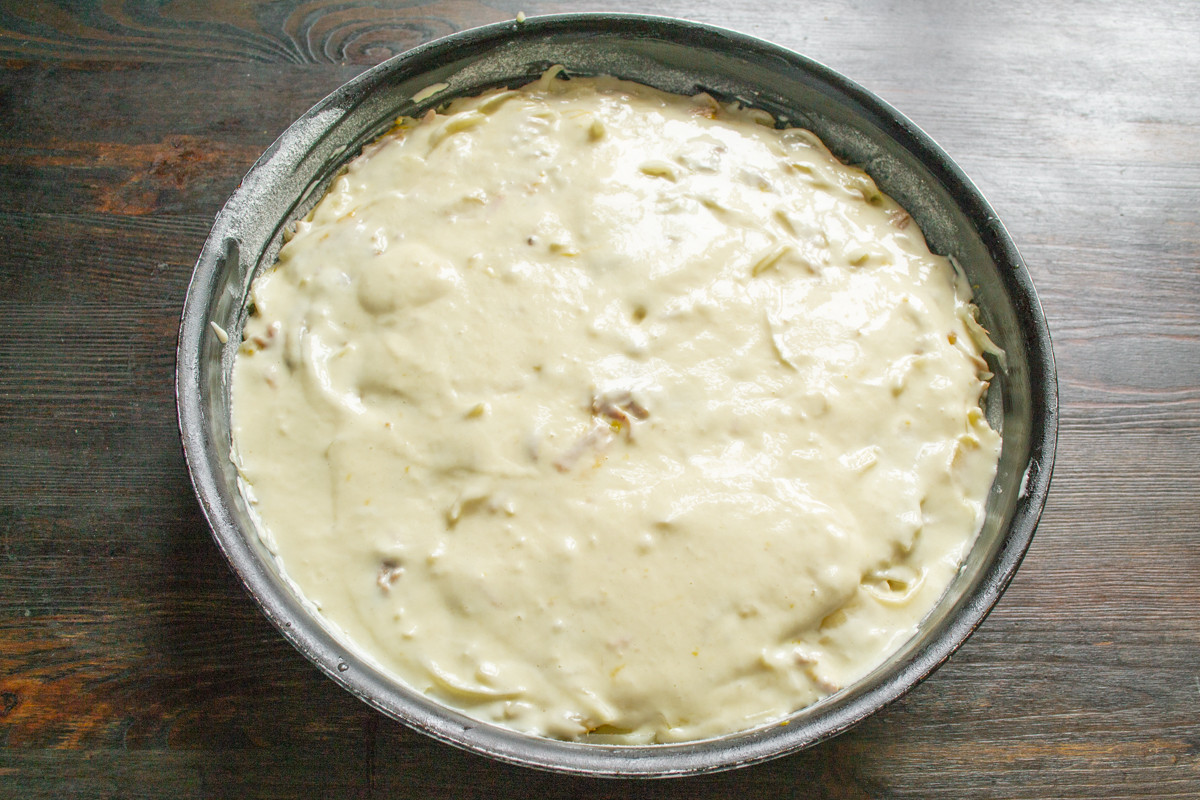 На начинку выливаем оставшееся тесто. Тесто распределяем по верху ложкой или лопаткой так, чтобы начинка не торчала наружу.