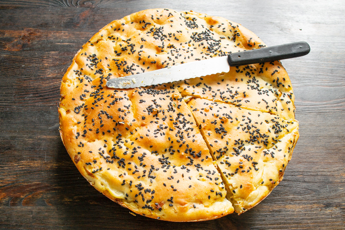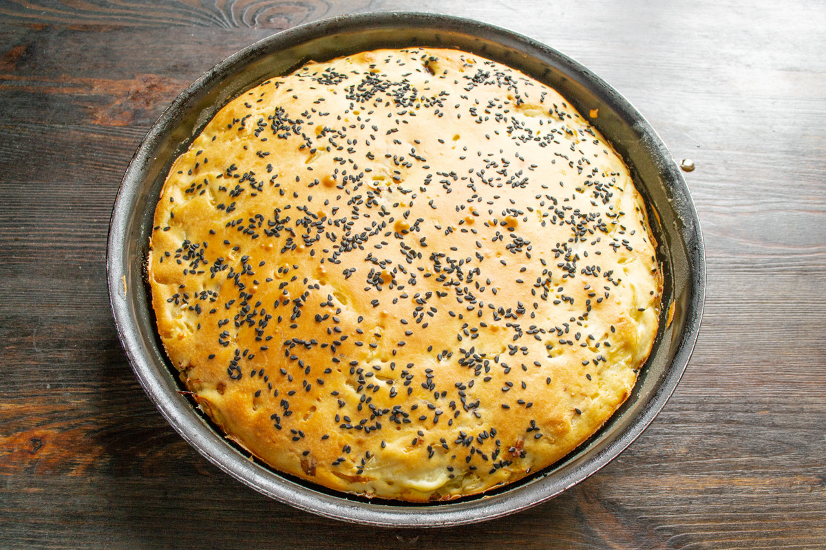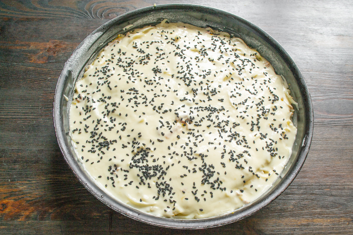 Посыпаем пирог черным кунжутом. Цвет кунжута не имеет значения, используйте белый, если есть только белый или смешайте два цвета.