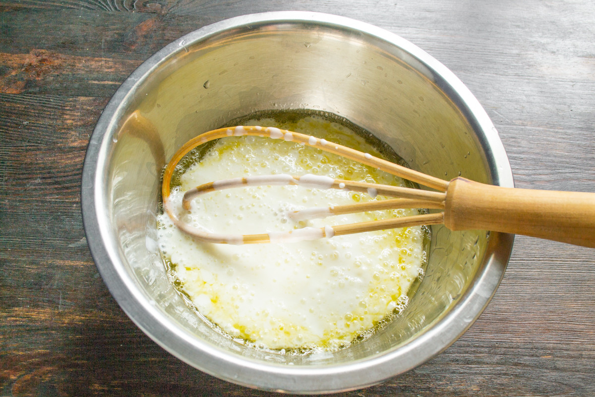 Замешиваем тесто венчиком. Тесто должно быть гладким, без комков муки.
