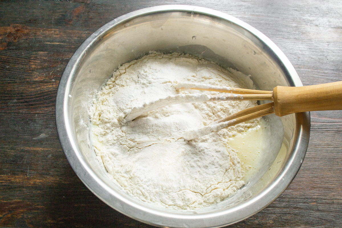 Смешиваем жидкие ингредиенты, насыпаем пшеничную муку, пищевую соду и разрыхлитель теста. Пищевая сода погасит кислоту кефира, разрыхлитель дополнительно распушит тесто. Желательно смешать сухие ингредиенты отдельно и просеять к жидким.