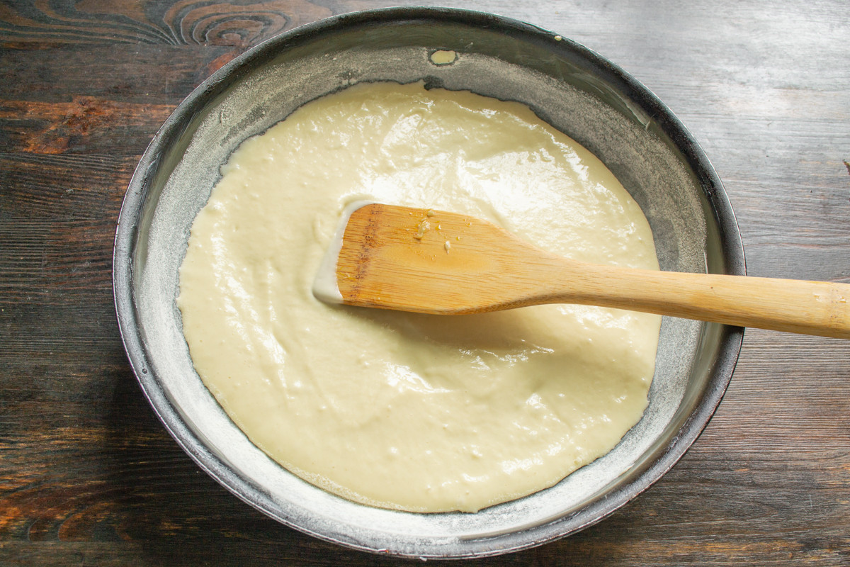 Сковороду или форму для выпечки смазываем размягченным сливочным маслом и посыпаем мукой. Выливаем половину теста в подготовленную форму.