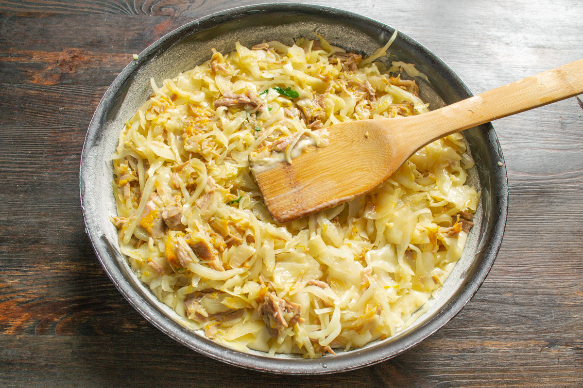 Отставляем тесто в сторону, чтобы отдохнуло несколько минут. Тем временем доделаем начинку. К тушеной капусте добавляем тушенку, перемешиваем, остужаем. Начинка для пирога может быть теплой, но не горячей!