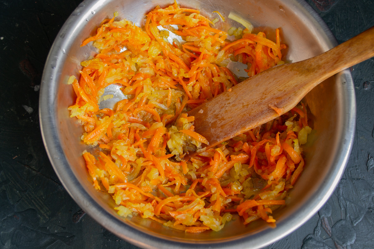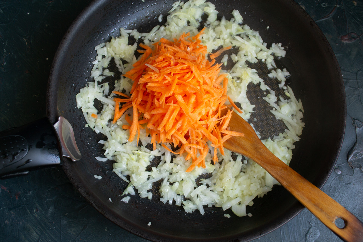 Мелко режем большую головку репчатого лука. В сковородку кладём столовую ложку сливочного масла, добавляем растительное или оливковое масло. В растопленное масло бросаем нарезанный лук, посыпаем солью, обжариваем несколько минут. Морковь натираем на крупной тёрке, добавляем к луку. Не любите морковку? Замените её корнем сельдерея или пастернаком.