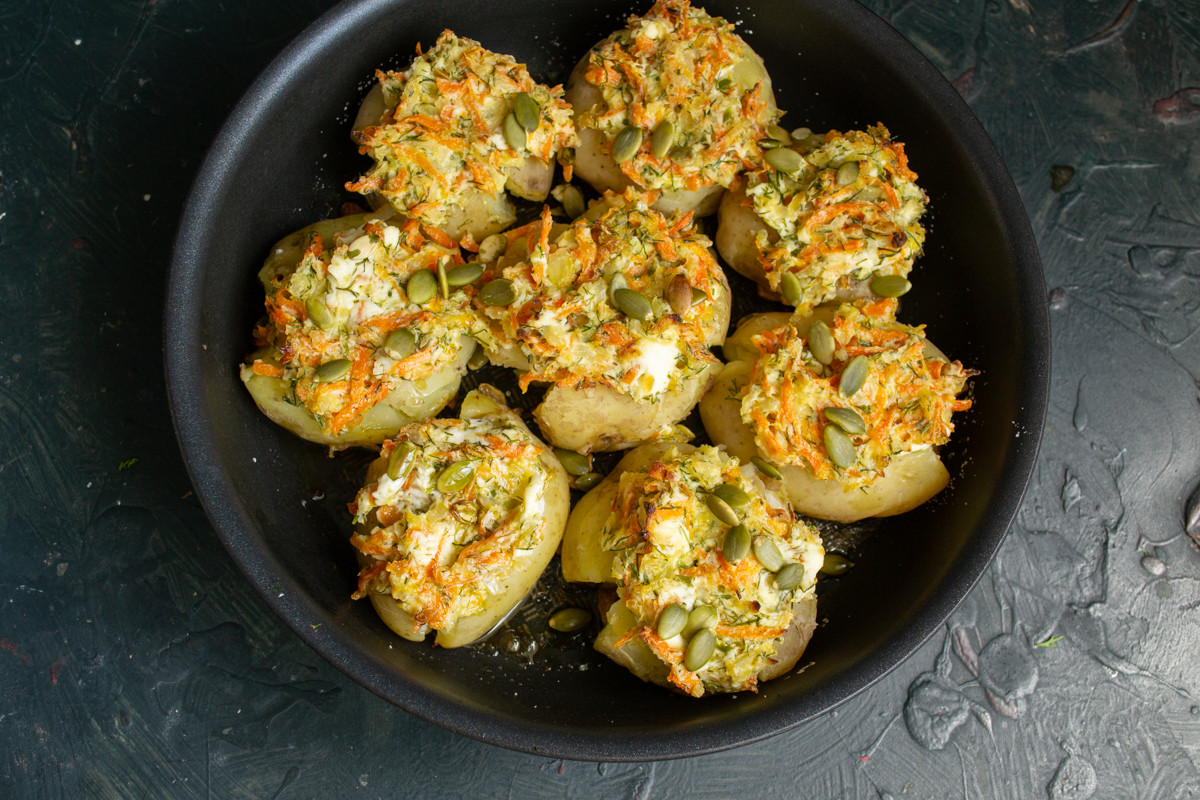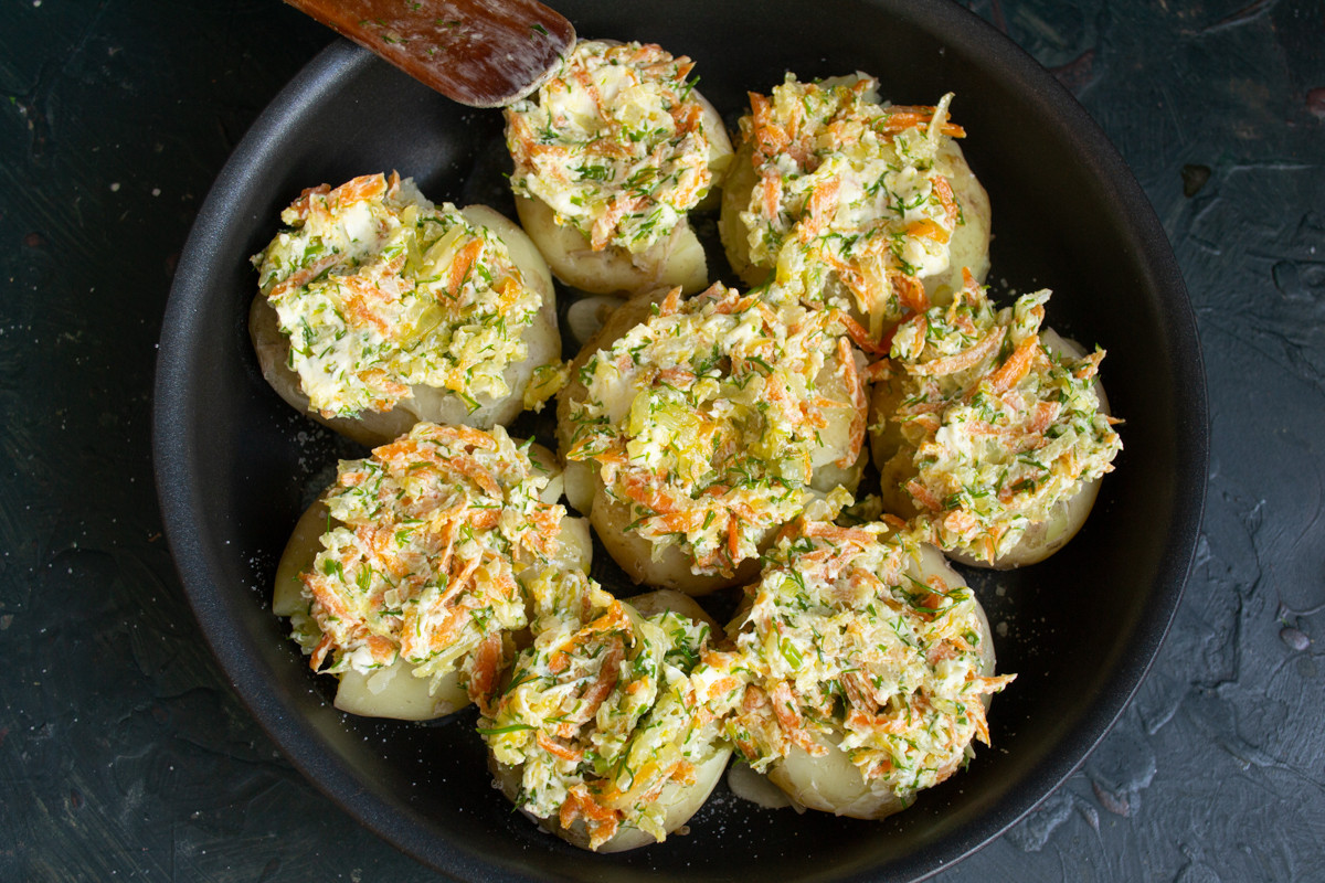 Способ приготовления запеченного картофеля с творожным сыром и овощами