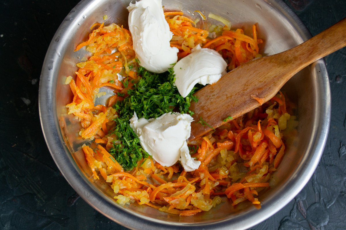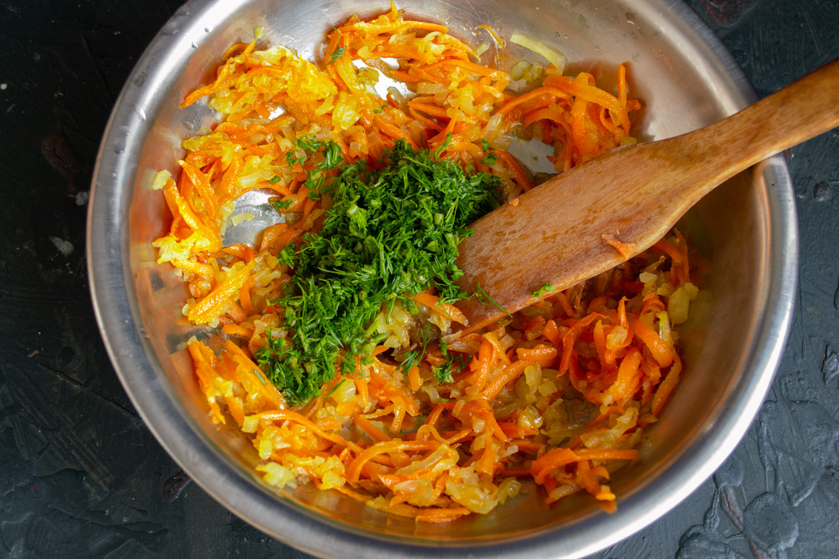 Мелко рубим пучок укропа. Добавляем к обжаренным овощам примерно две столовые ложки рубленной зелени. Меняя зелень можно добиться разных вкусов простейшим способом, к примеру, заменить укроп кинзой или шнитт луком.