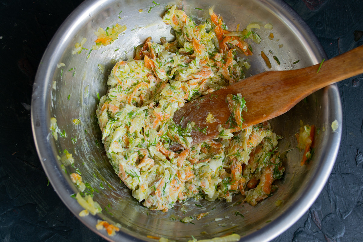 Тщательно перемешиваем ингредиенты начинки. Пробуем, солим если нужно.