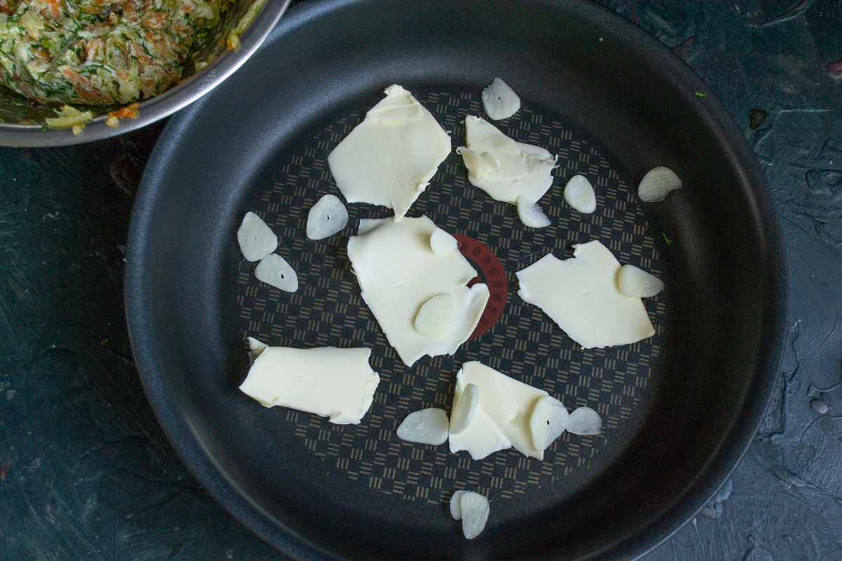 Зубчики чеснока нарезаем тонкими пластинками. В сковородку кладём кусочки сливочного масла и нарезанный чеснок. Пластинки чеснока при запекании зажарятся до состояния чипсов, если вам не нравится такой способ, то чеснок можно добавить в начинку.