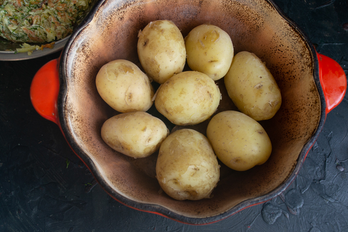 Клубни молодого картофеля тщательно моем щеткой. Отвариваем картошку до готовности, сливаем воду, подсушиваем картошку.