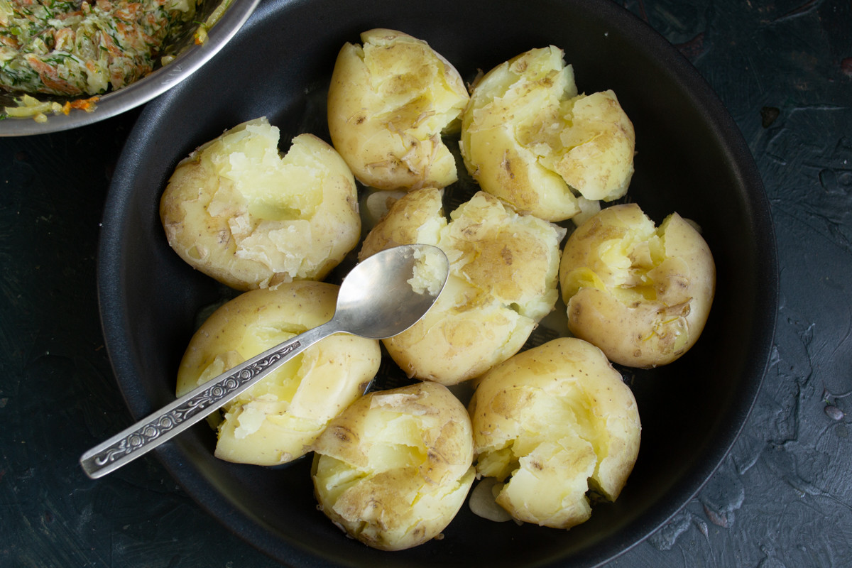 Кладём варёную картошку в сковородку с маслом и чесноком. Прижимаем картофелины лопаткой или столовой ложкой, чтобы они примялись и потрескались. Можно дополнительно сделать чайной ложечкой углубления для соуса. Мятую картошку посыпаем солью.