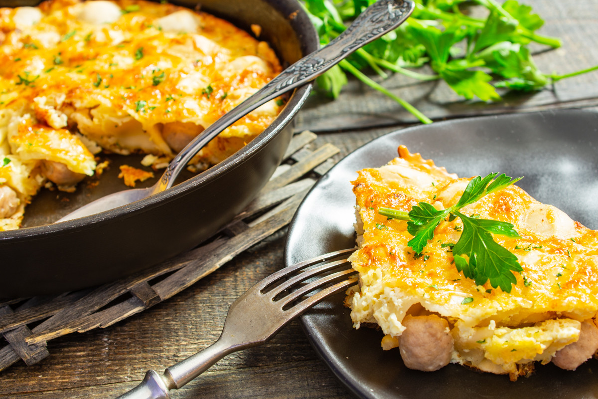 Разогреваем духовой шкаф до температуры 180 градусов по Цельсию. Ставим запеканку в разогретый духовой шкаф на 20 минут. Запекаем до золотистой корочки. Пельменное тесто впитает влагу из омлета, пельмени запекутся и все покроется золотистой сырной корочкой. Не передерживайте запеканку, пусть останется сочной.
