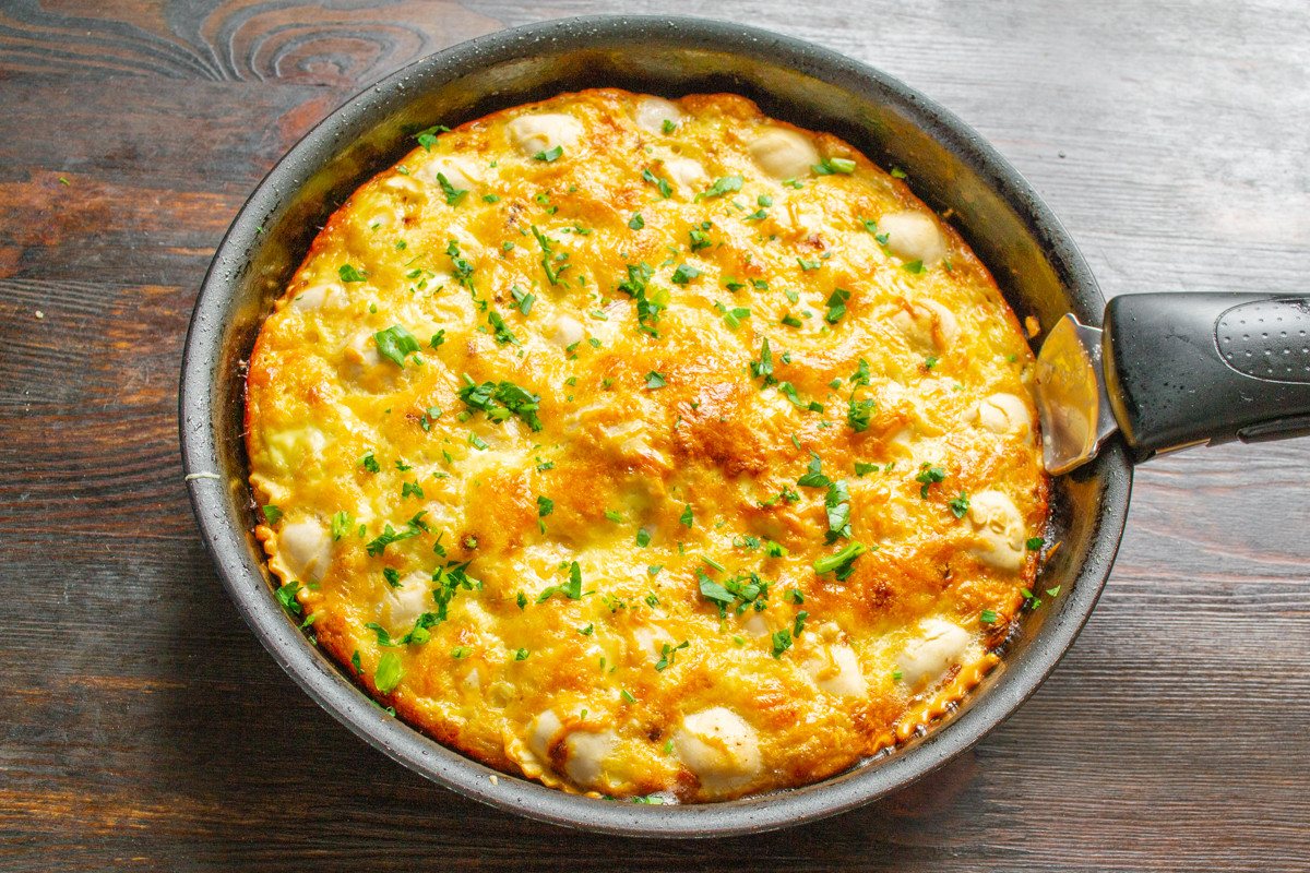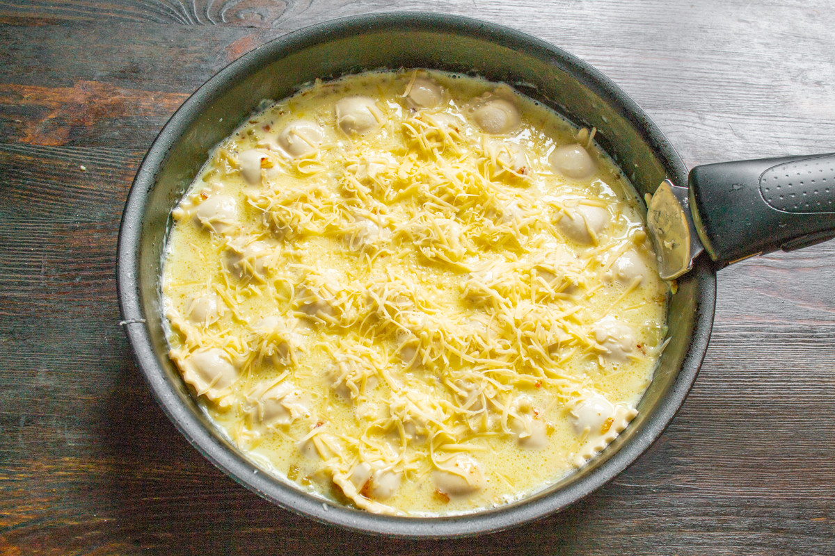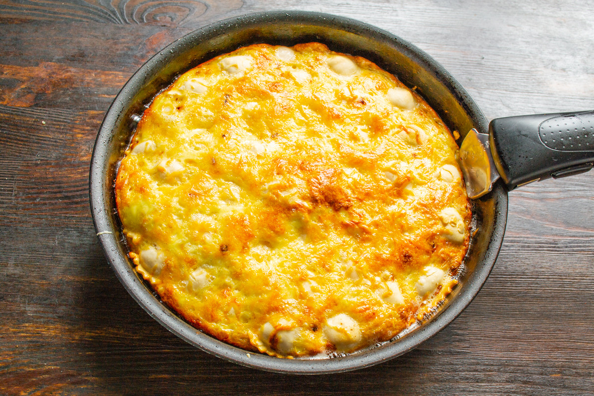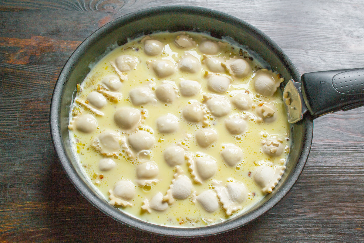 Выливаем в сковороду наш омлет из яиц, майонеза и молока. Смесь должна почти полностью закрыть пельмени, если не хватает, то смешайте ещё одной яйцо со столовой ложкой молока и вылейте сверху.