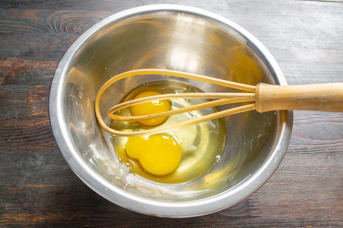 Разбиваем в миску куриные яйца, насыпаем щепотку соли. Взбиваем яйца венчиком, сильно вспенивать не нужно, только перемешать до однородности.