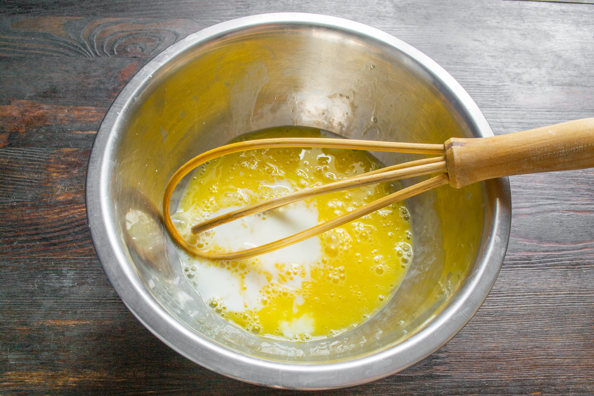 Добавляем майонез и молоко. Еще раз взбиваем смесь, она получится похожей на жидкую смесь для омлета. По желанию вы может добавить больше яиц, а вот больше майонеза класть не советую, будет очень калорийно.