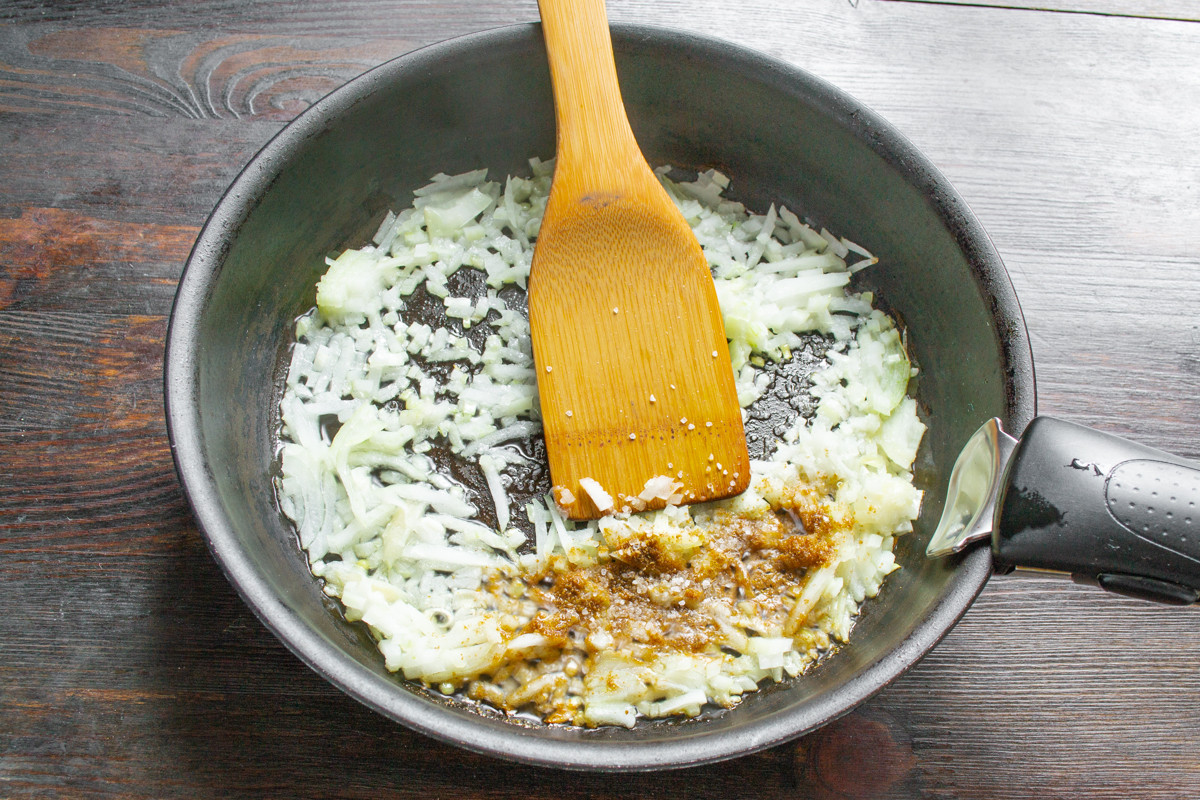 Мелкими кубиками нарезаем большую головку репчатого лука. В сковороду наливаем столовую ложку растительного масла, можно добавить немного сливочного, лук любит сливочное масло. В разогретое масло бросаем нарезанный лук, посыпаем щепоткой соли, приправляем смесью любимых специй или уцхо-сунели. Обжариваем лук на среднем огне 5-7 минут, перемешиваем, чтобы не пригорел.