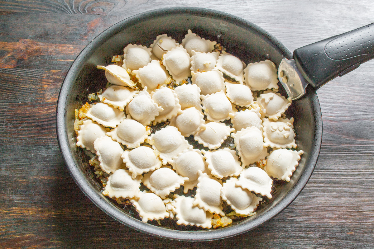 Замороженные пельмени высыпаем в сковороду. В этом рецепте пельмени с телятиной, они маленькие и очень вкусные. Тесто достаточно тонкое, мясо сочное. Но вы можете готовить это блюдо с любыми пельменями.