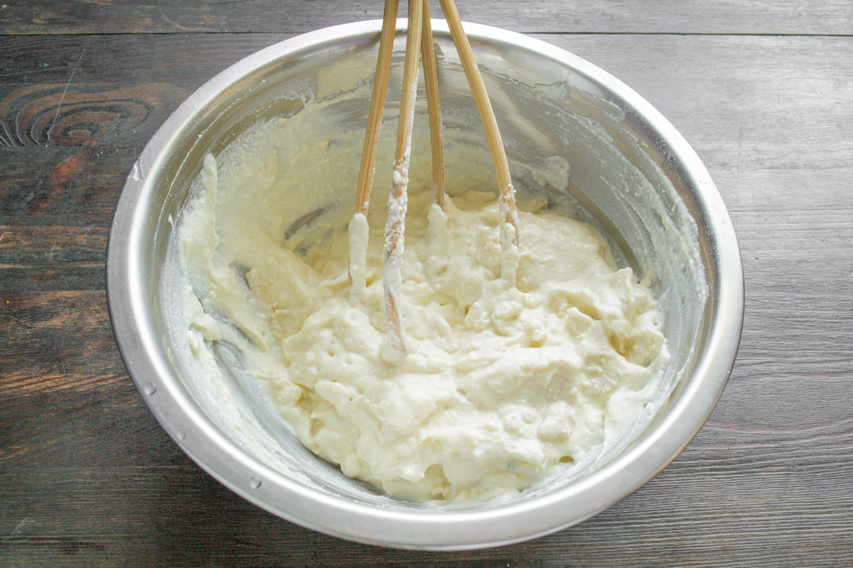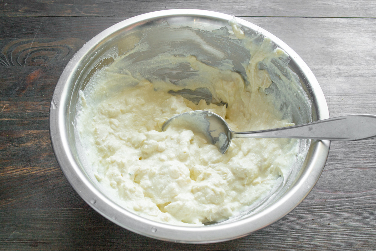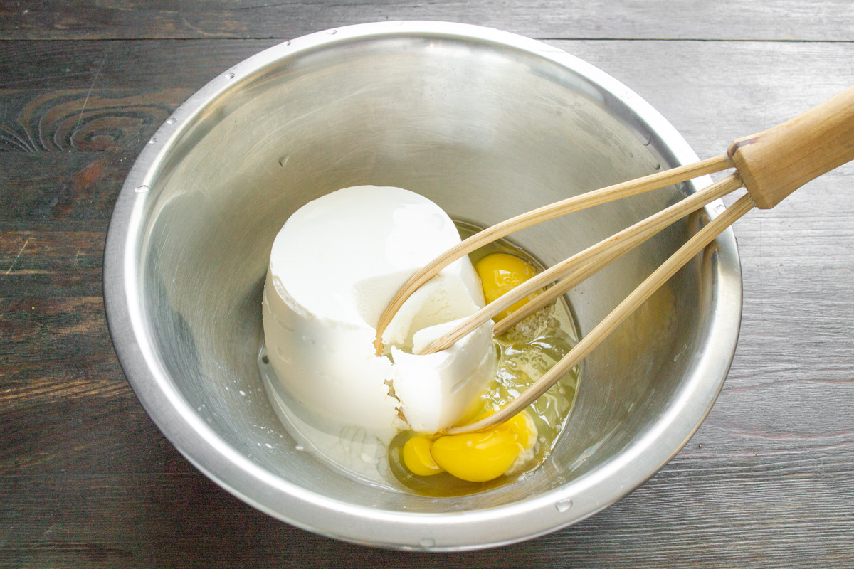 В миску выкладываем рикотту, разбиваем крупные куриные яйца, насыпаем соль по вкусу. Вы можете заменить рикотту мягким творогом или мягким сливочным сыром. Если творог с комочками, то протрите его дважды сквозь мелкое или измельчите погружным блендером вместе с яйцами до кремовой консистенции.