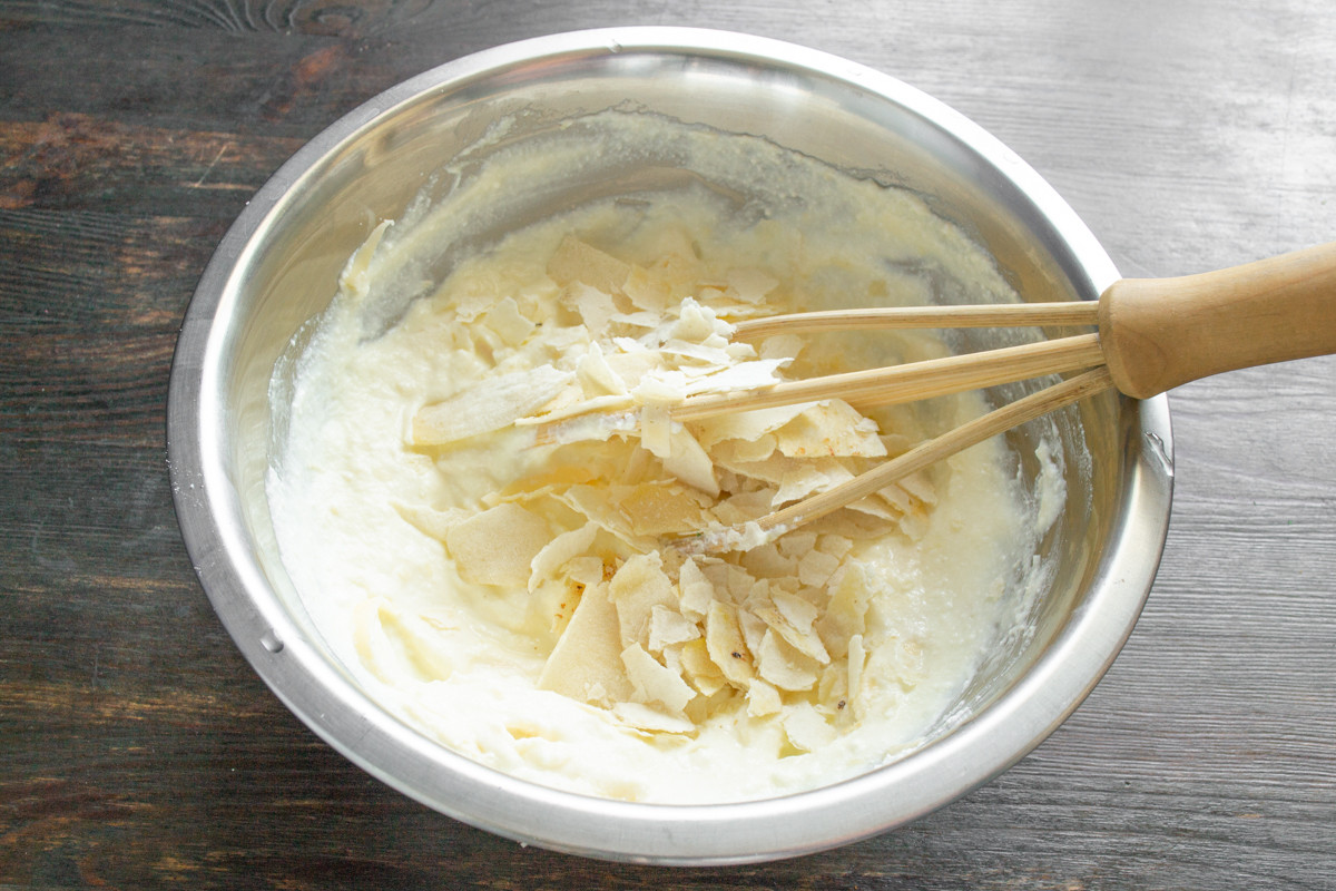 Смешиваем тесто. Тонкий лаваш нарезаем на мелкие кусочки. Для этого рецепта понадобится 1 небольшой лаваш размером 35х35 сантиметров или чуть больше. Вы можете использовать зачерствевший лаваш в этом рецепте, разломайте черствый лаваш мелко и добавьте в тесто.