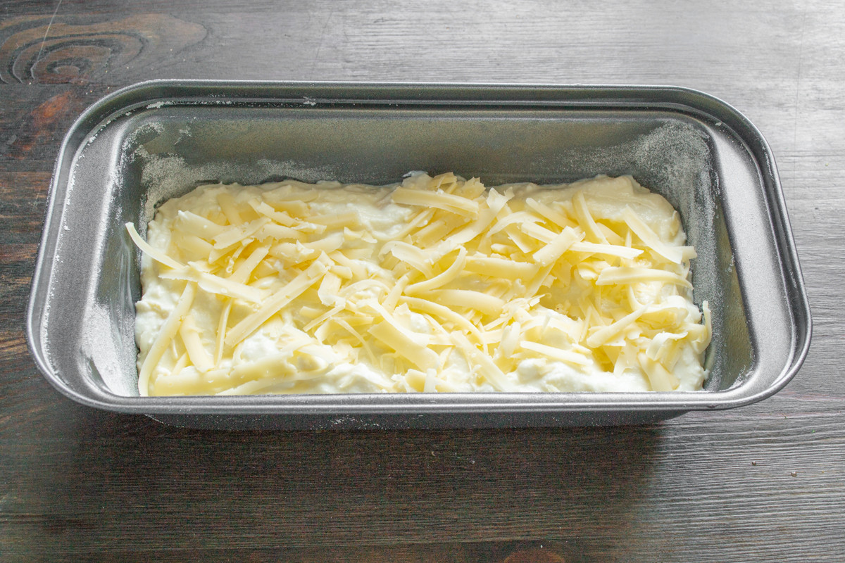 Форму для кекса размер 22х11х7 смазываем размягченным сливочным маслом, посыпаем пшеничной мукой. Излишек муки стряхиваем. Выкладываем тесто в форму, разравниваем, сверху посыпаем оставшимся тертым сыром.