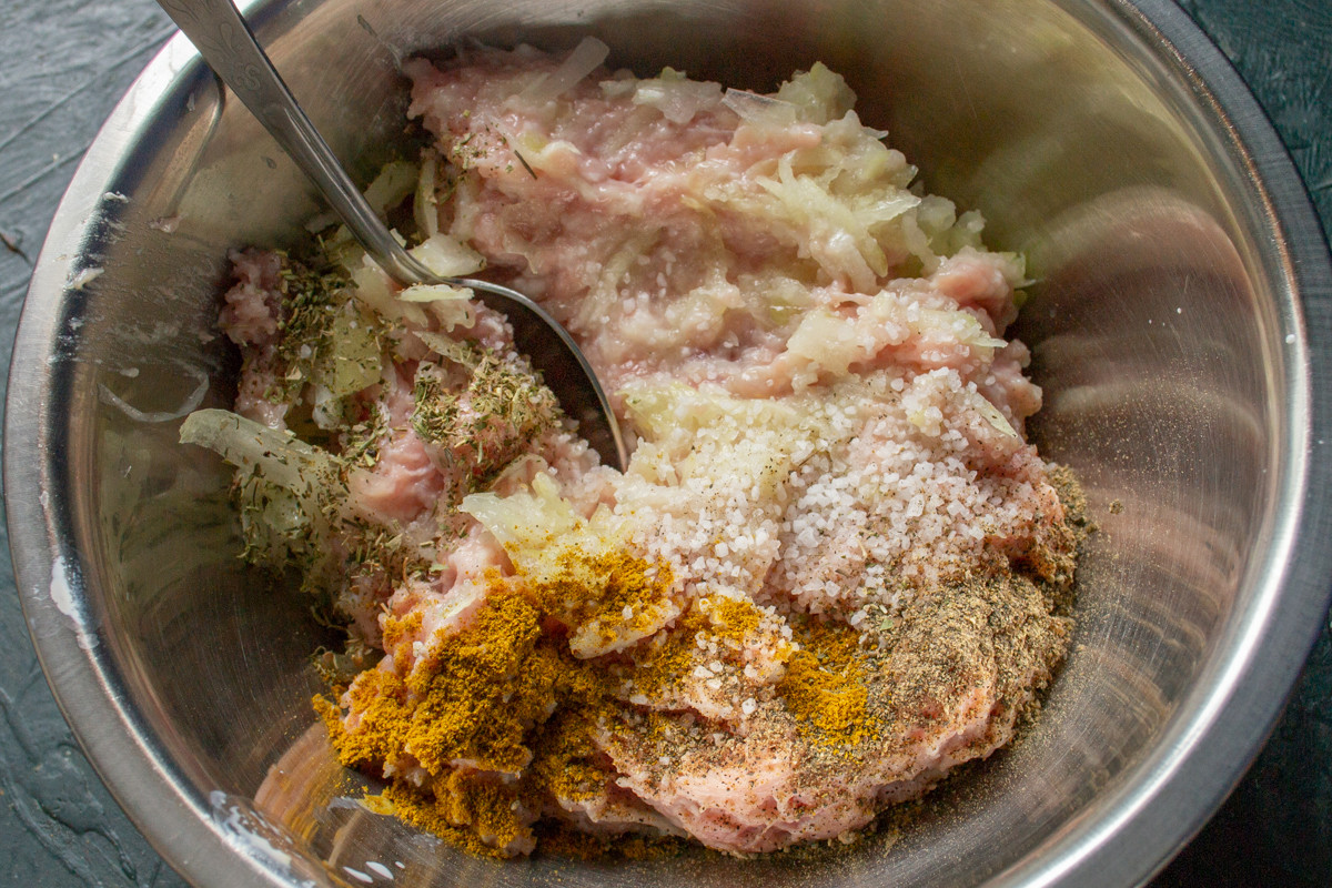 Фарш с луком по вкусу солим, перчим, насыпаем немного паприки, по желанию – сушеные травки, к примеру, укроп и петрушка. Вливаем 40 мл холодного молока или ледяной воды.