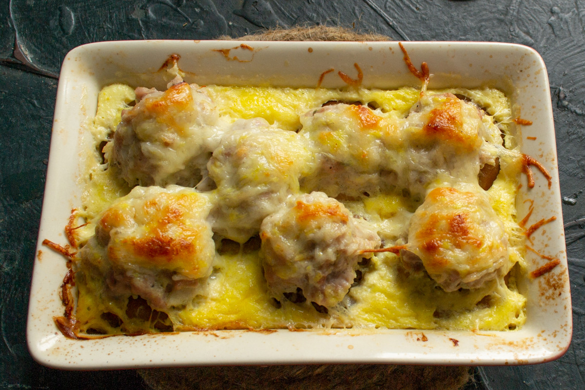 Вливаем яичную смесь в форму так, чтобы сушки утонули, а фрикадельки оставались сверху.